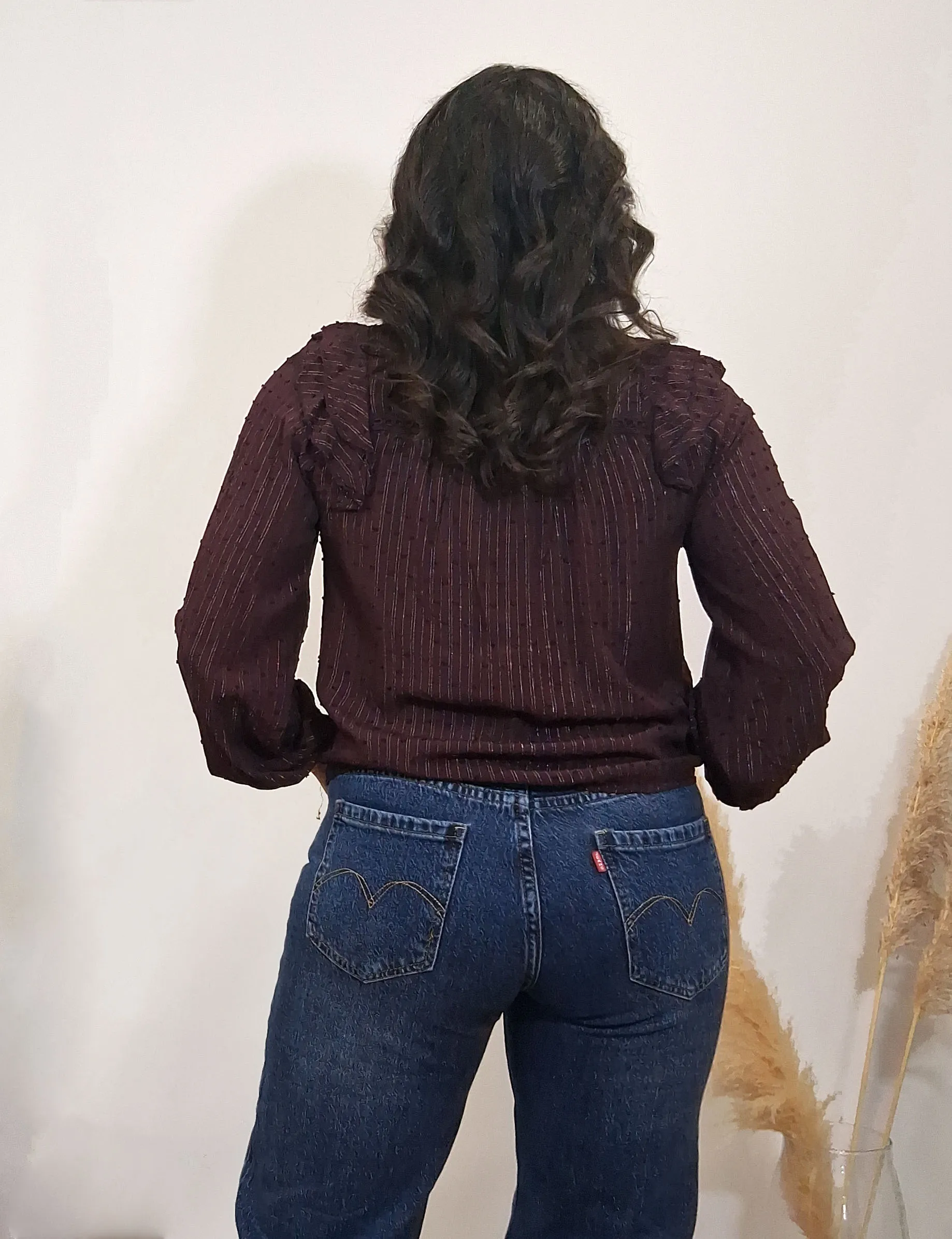 Blusa en color berenejna con brillo y detalle de volantes en los hombros.