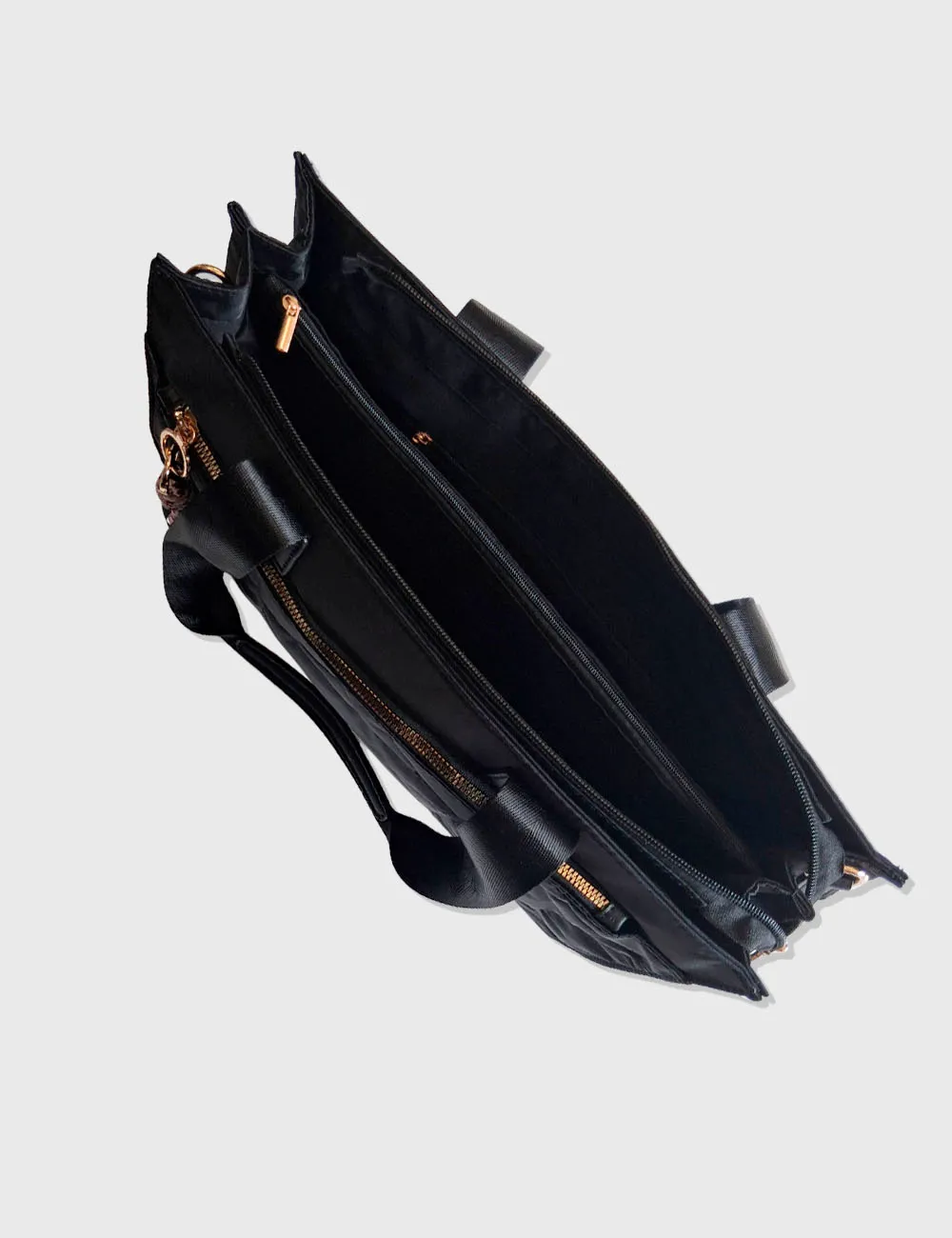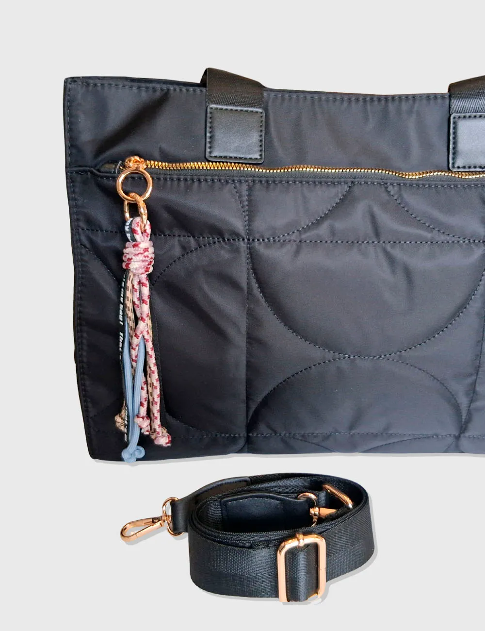 Bolso de gran tamaño con diferentes apartados y detalle de llavero con cuerdas. Ideal para documentos. Color negro.