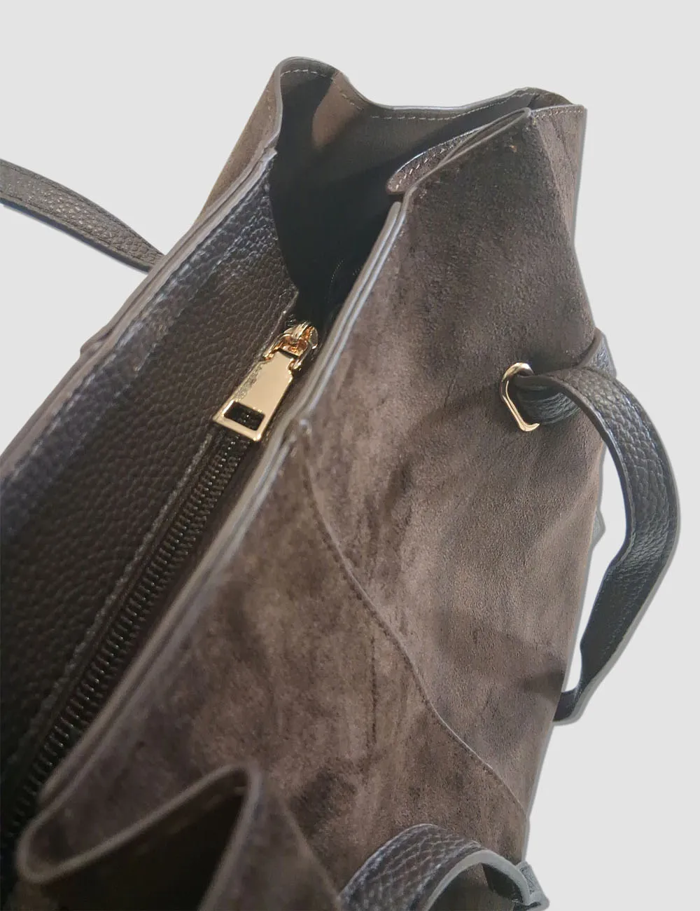 Bolso estilo shopper en antelina marrón chocolate y asas largas. Incluye organizador interior con cremallera en color marrón.