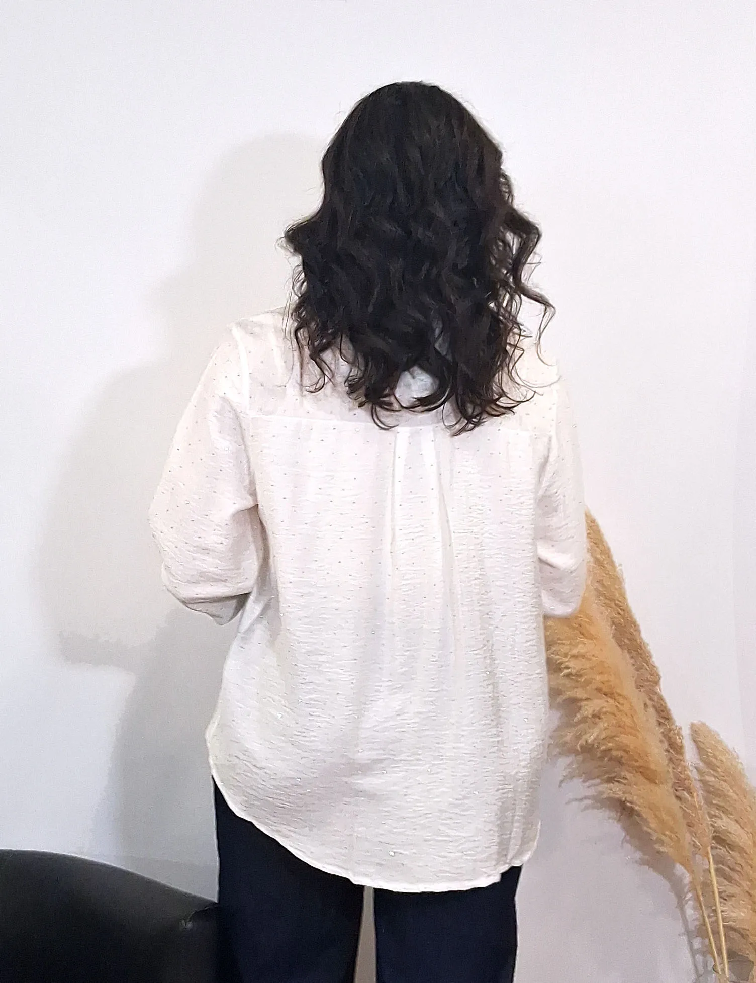 Camisa en tejido ligero con detalle de brillos y broches para adornar los botones. Color blanco.