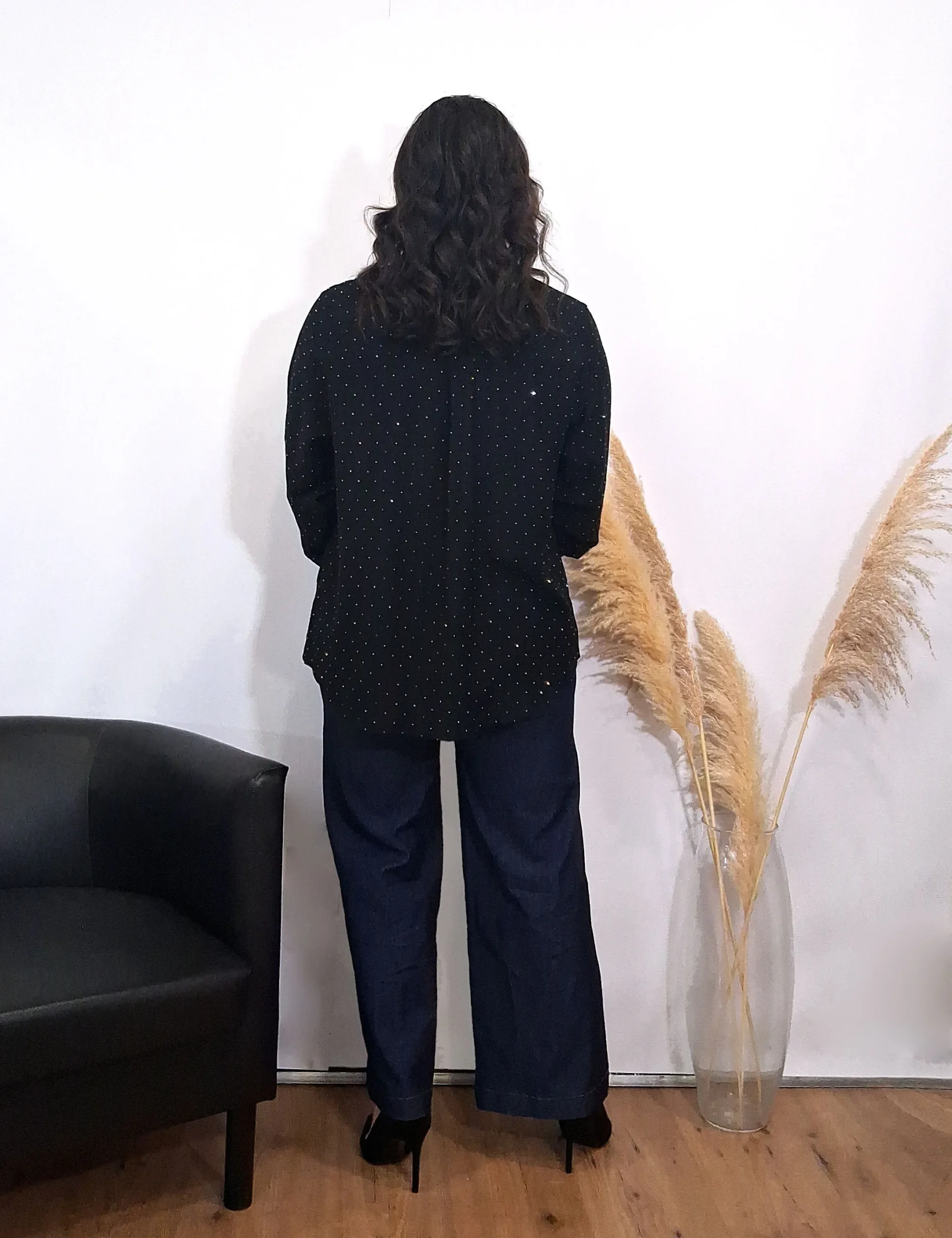 Camisa en tejido ligero con detalle de brillos y broches para adornar los botones. Color negro.