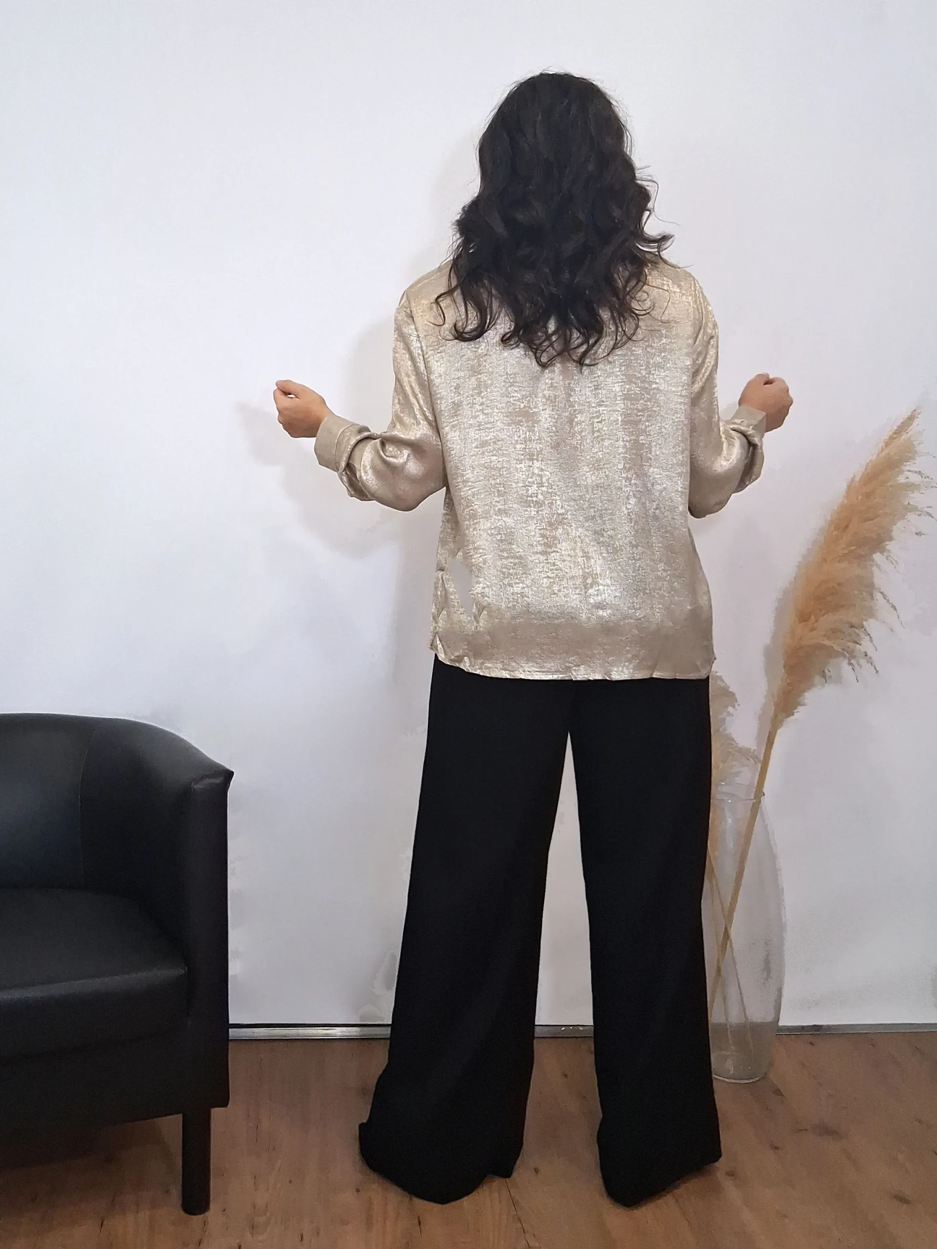 Camisa de manga larga con bolsillos en tejido lurex en color dorado.