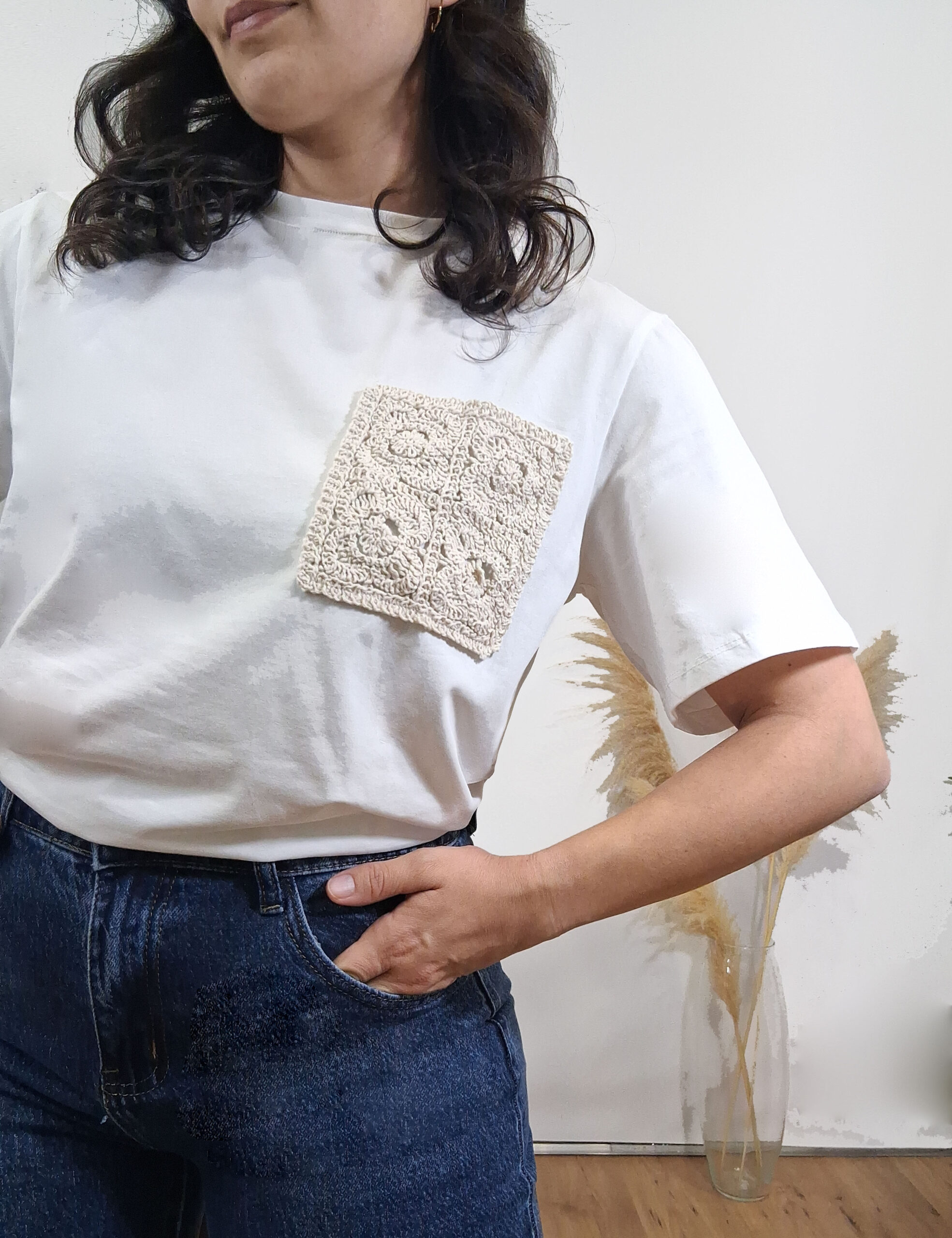 Camiseta manga corta con detalle de bolsillo en tejido estilo crochet. Color crudo.