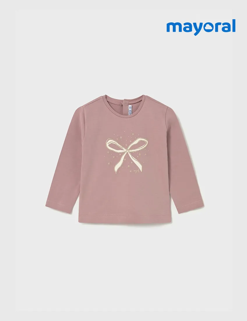 Camiseta de bebé niña de manga larga con cuello redondo y estampado de lazito con brillos. Color rosa. Mayoral.