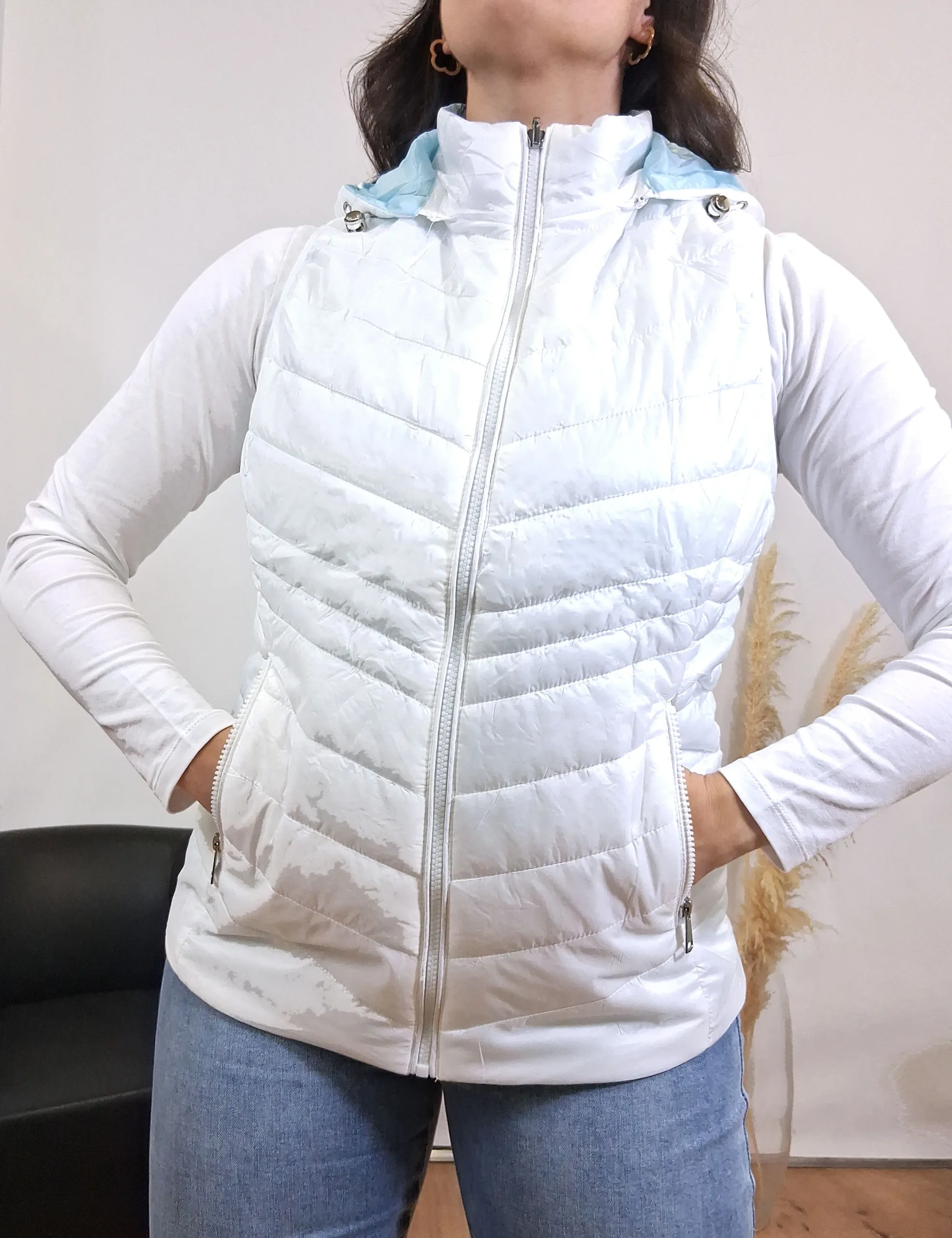 Chaleco acolchado en color blanco con forro interior en color azul claro.