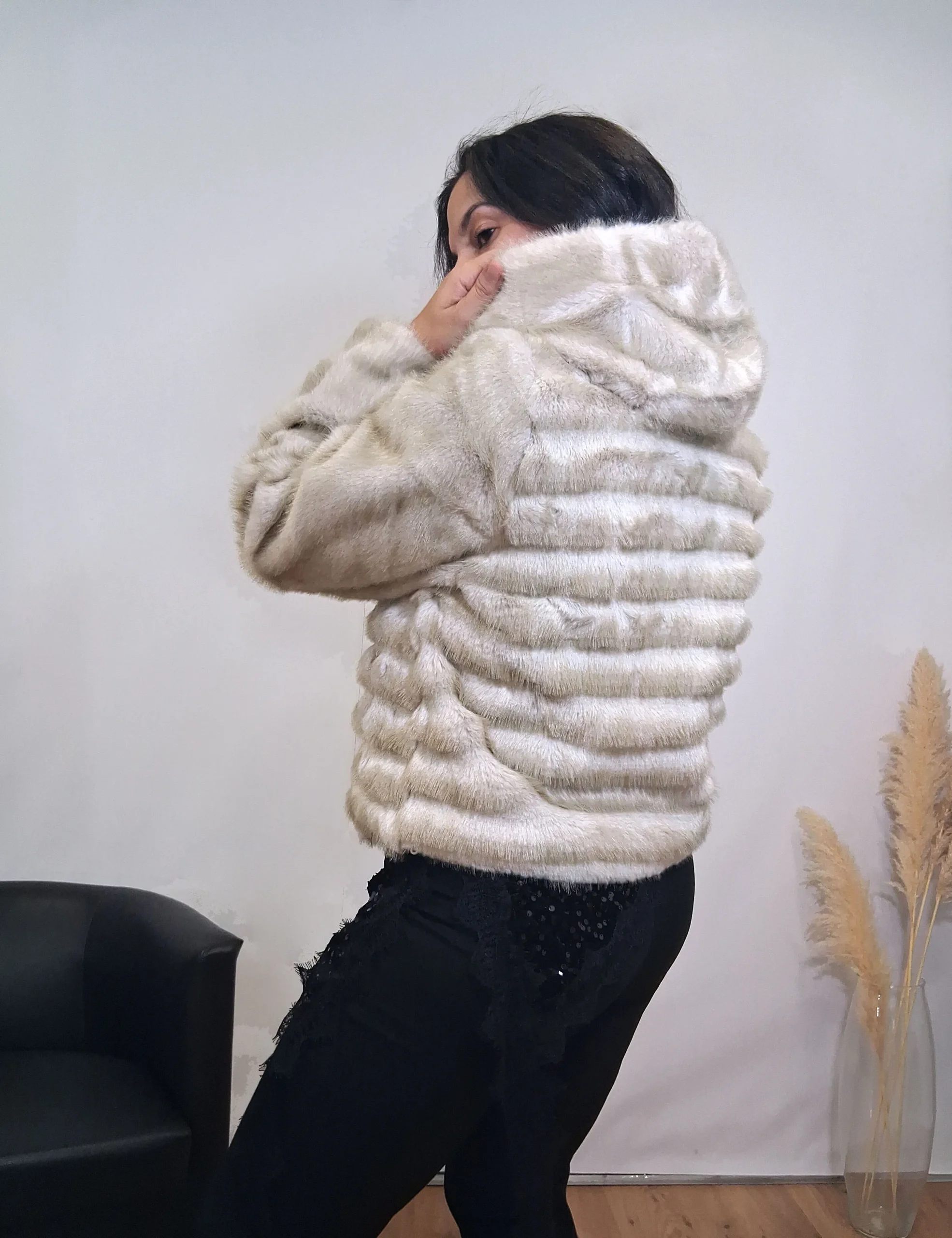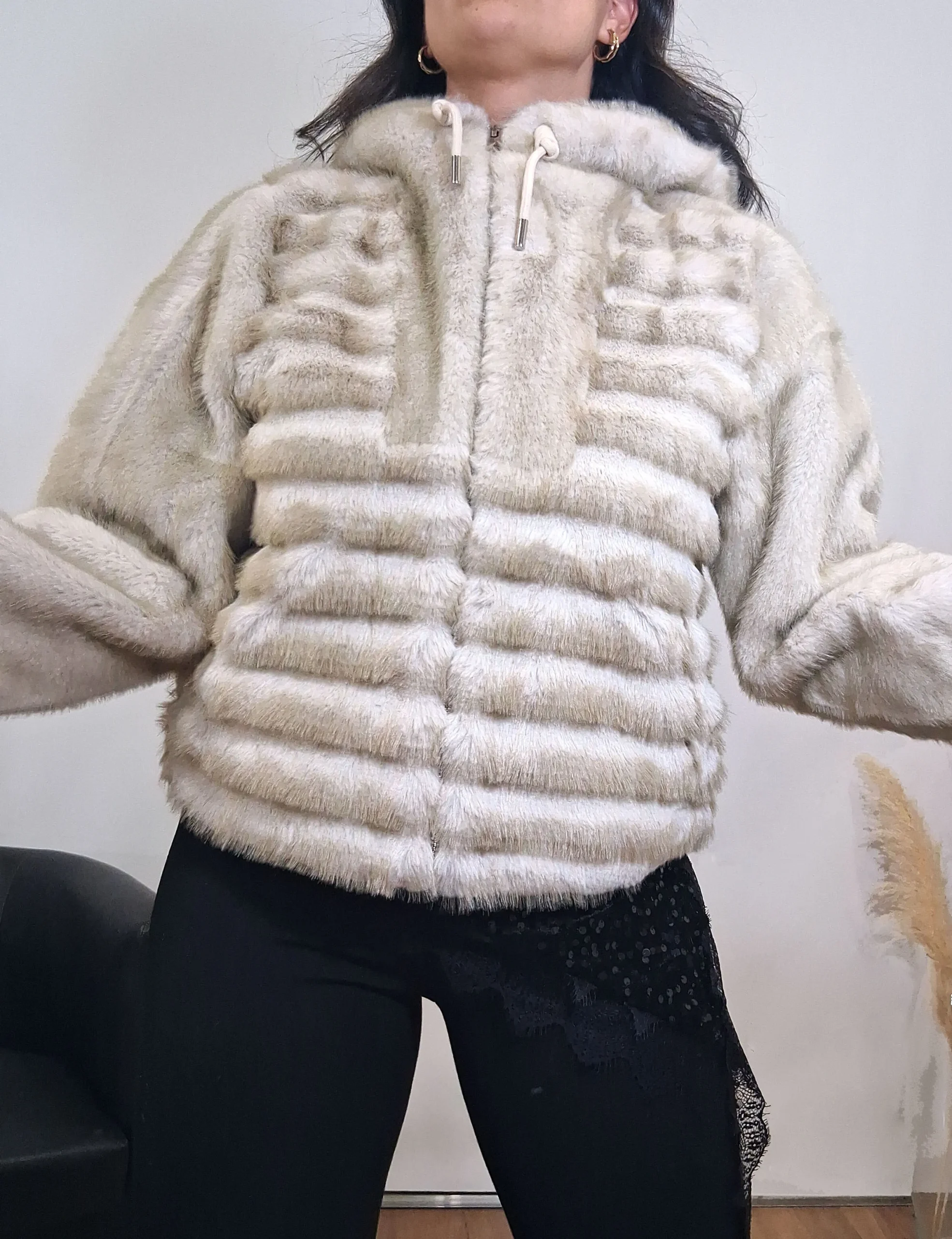 Chaqueta de pelo con capucha y cremallera. Color crema.
