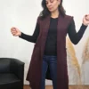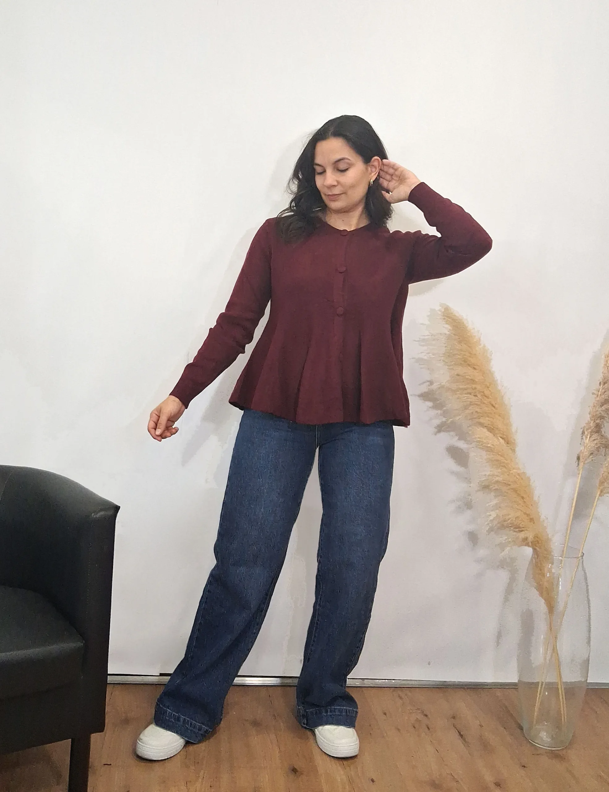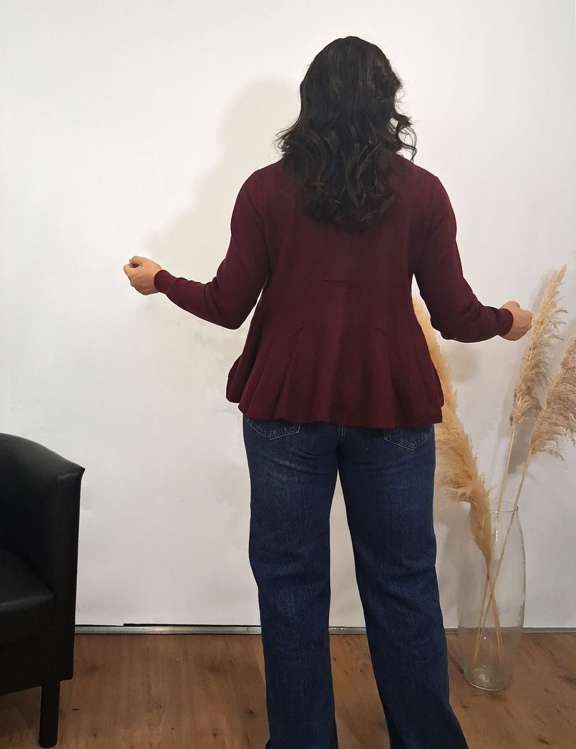 Chaqueta de punto con volante en la parte inferior en color burdeos.