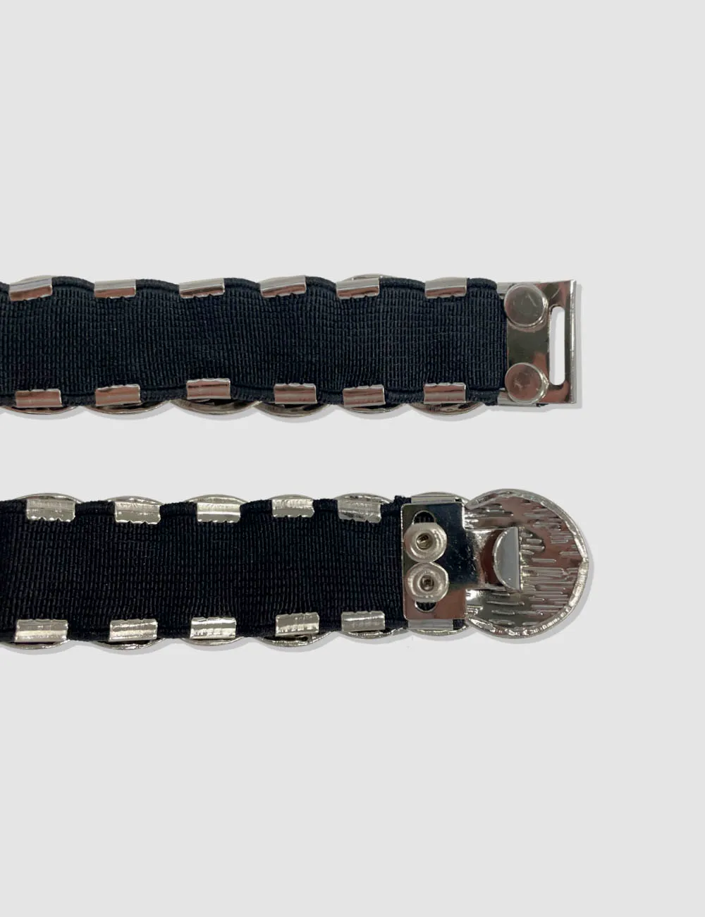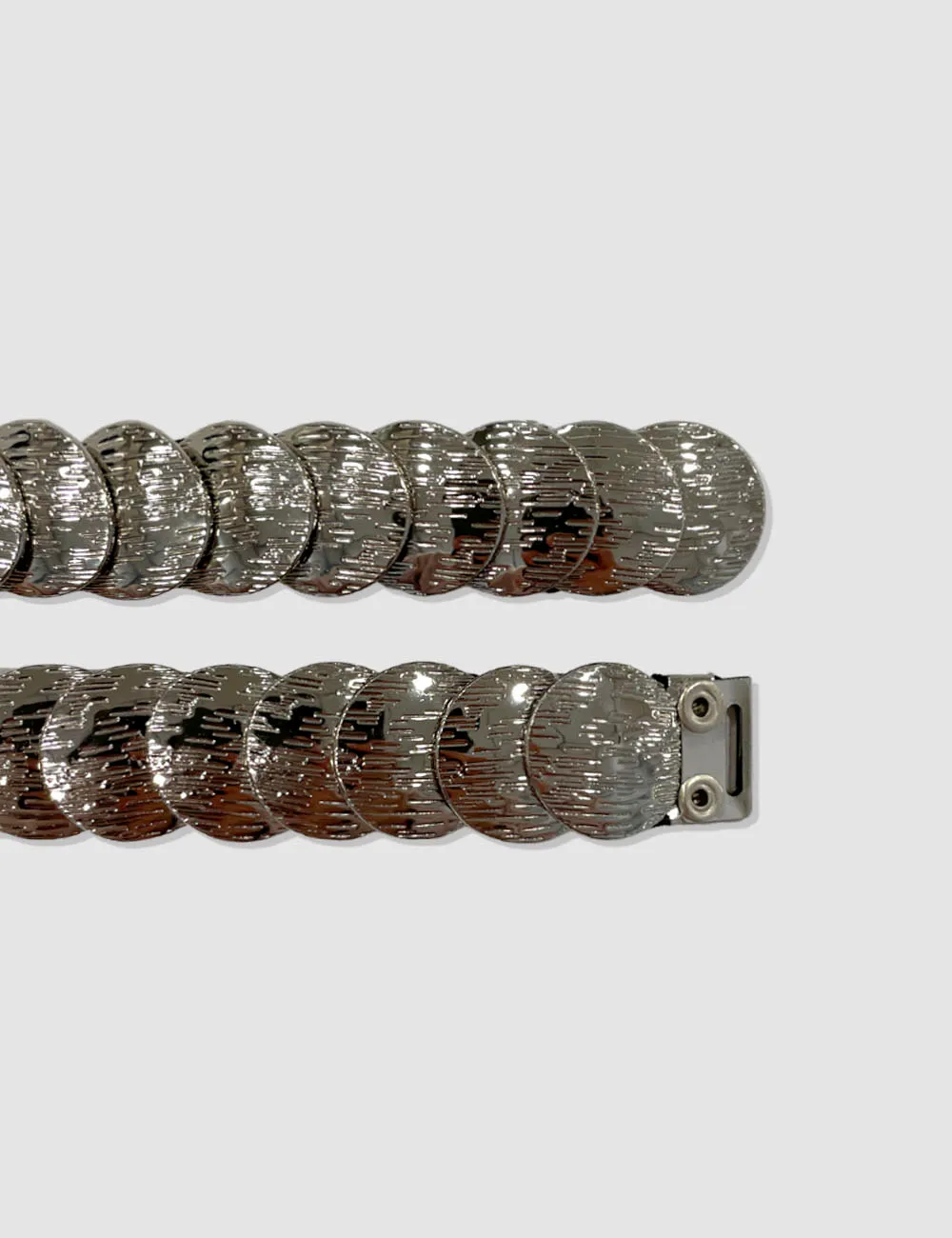 Cinturón elástico con diseño de formas circulares superpuestas en color plateado.