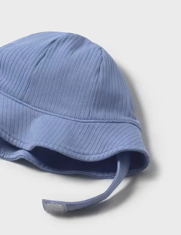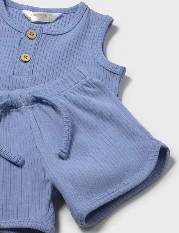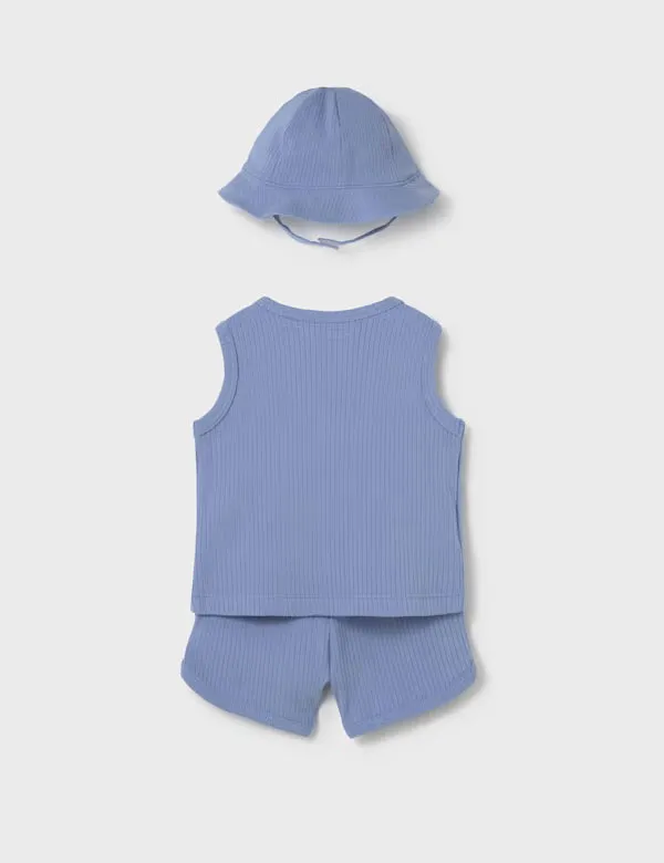Conjunto de tres piezas de la marca Mayoral compuesto por camiseta de tirantes, short y gorro.