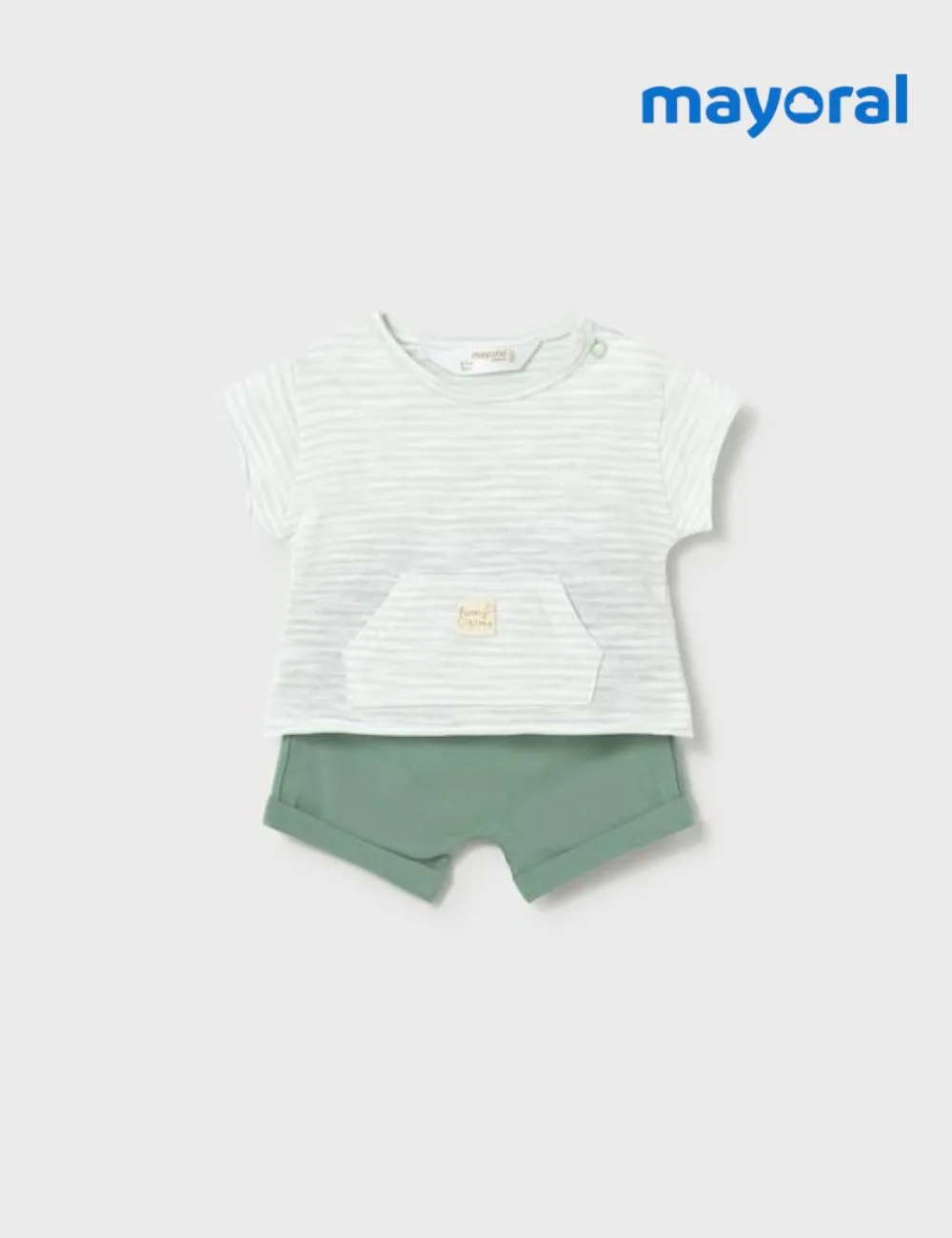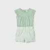 Conjunto Mayoral compuesto por camiseta de manga corta de rayas y bermudas verde alga. Color Verde Alga y blanco.