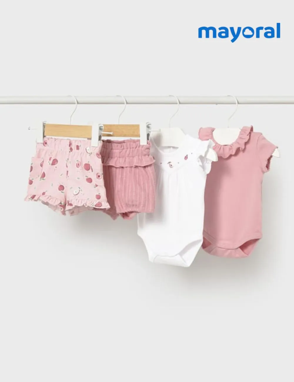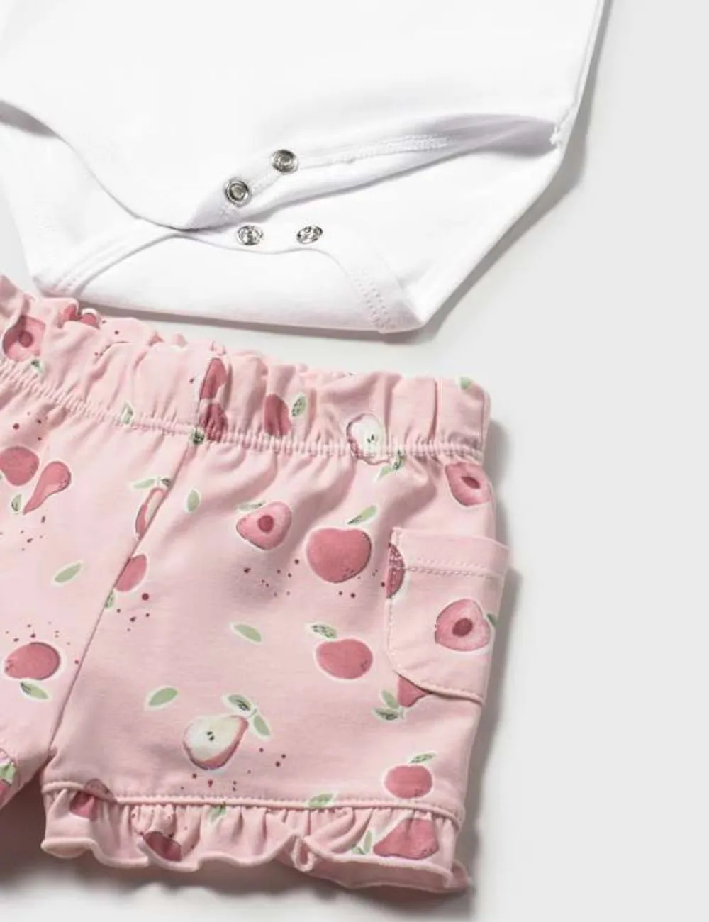 Conjunto Mayoral compuesto por bodie  y short frutas,Color Blanco y rosa.