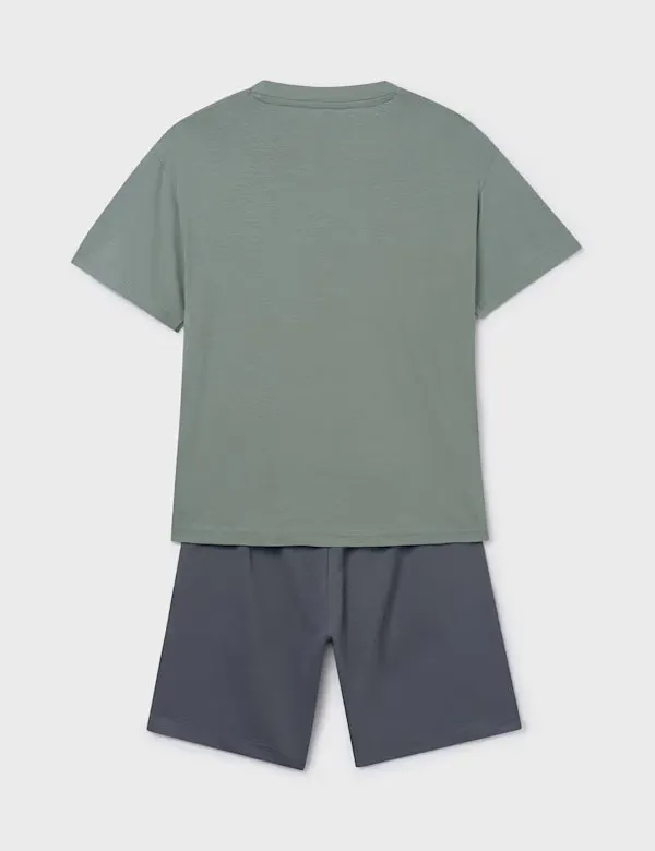 Conjunto de dos piezas de la marca Mayoral compuesto por camiseta de manga corta color verde y bermudas gris oscuro.