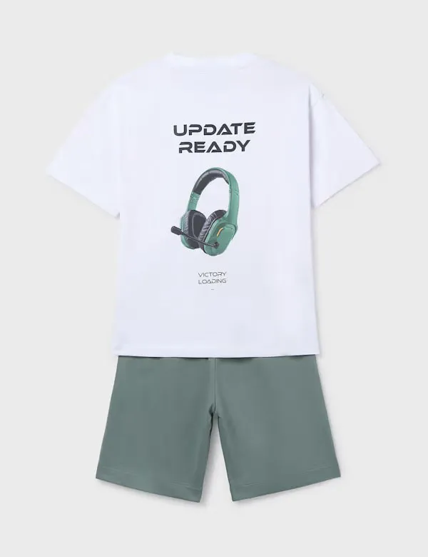 Conjunto de dos piezas de la marca Mayoral compuesto por camiseta de manga corta blanca y bermudas color verde.