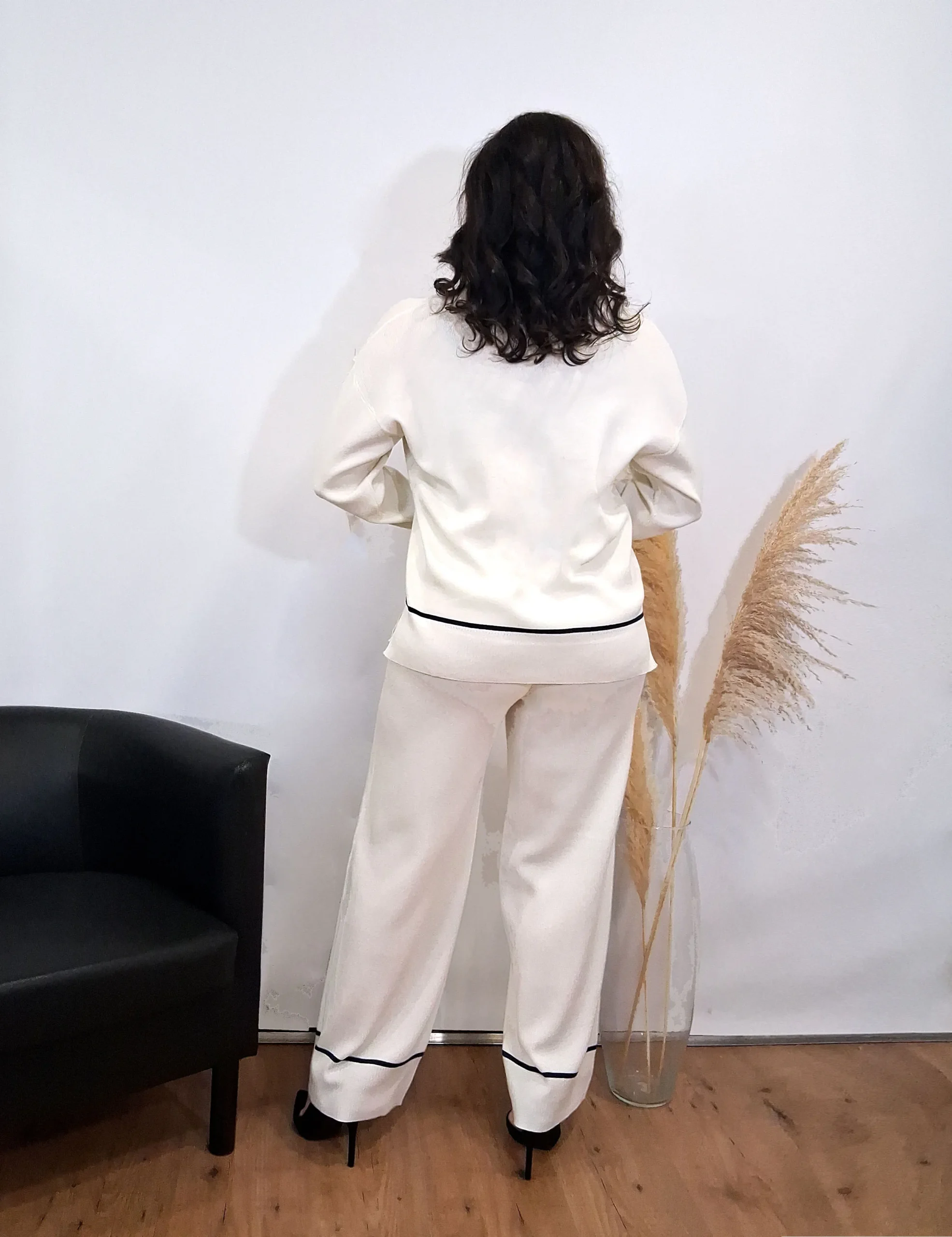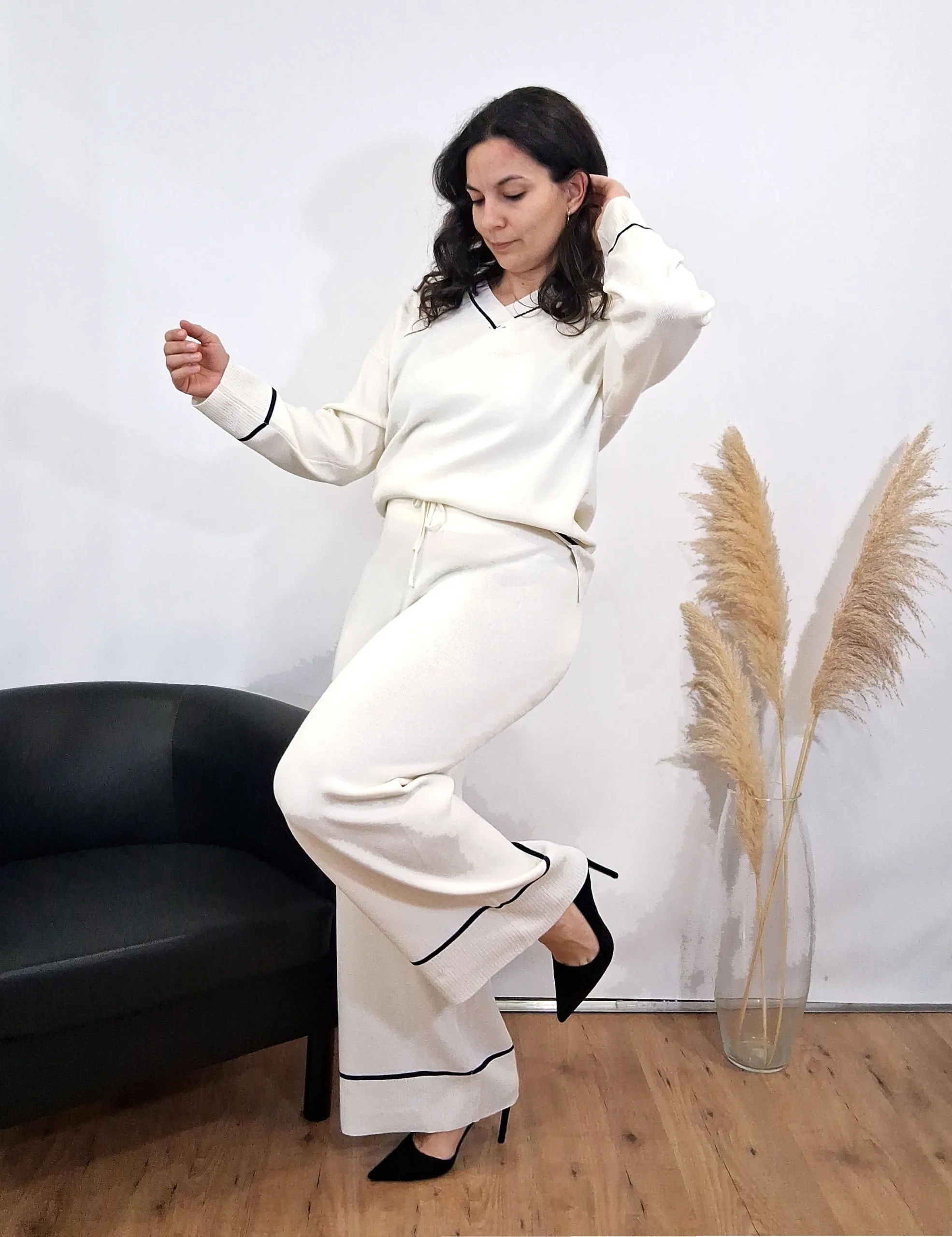 Conjunto de punto de dos piezas: pantalón largo y parte de arriba de manga larga y cuello de pico con detalle de rayas. Color crudo.