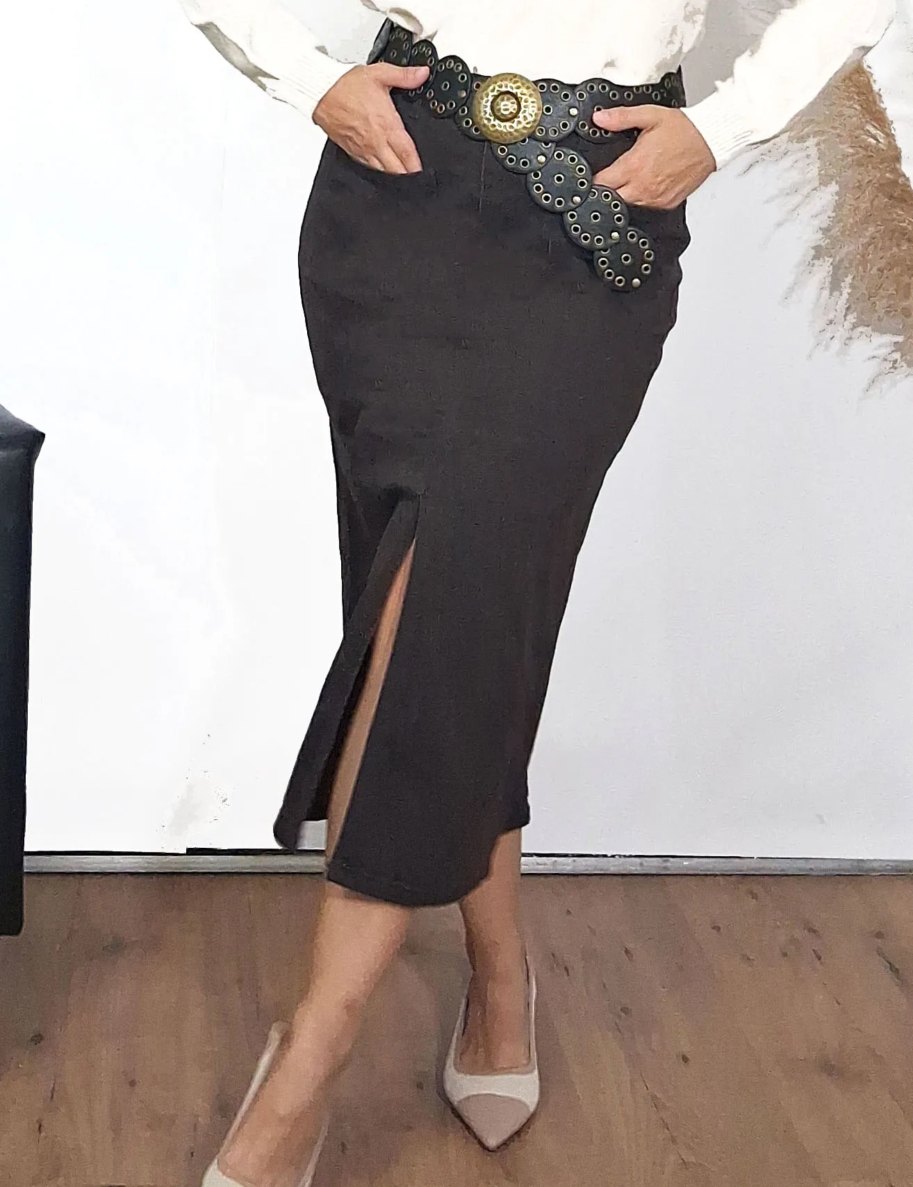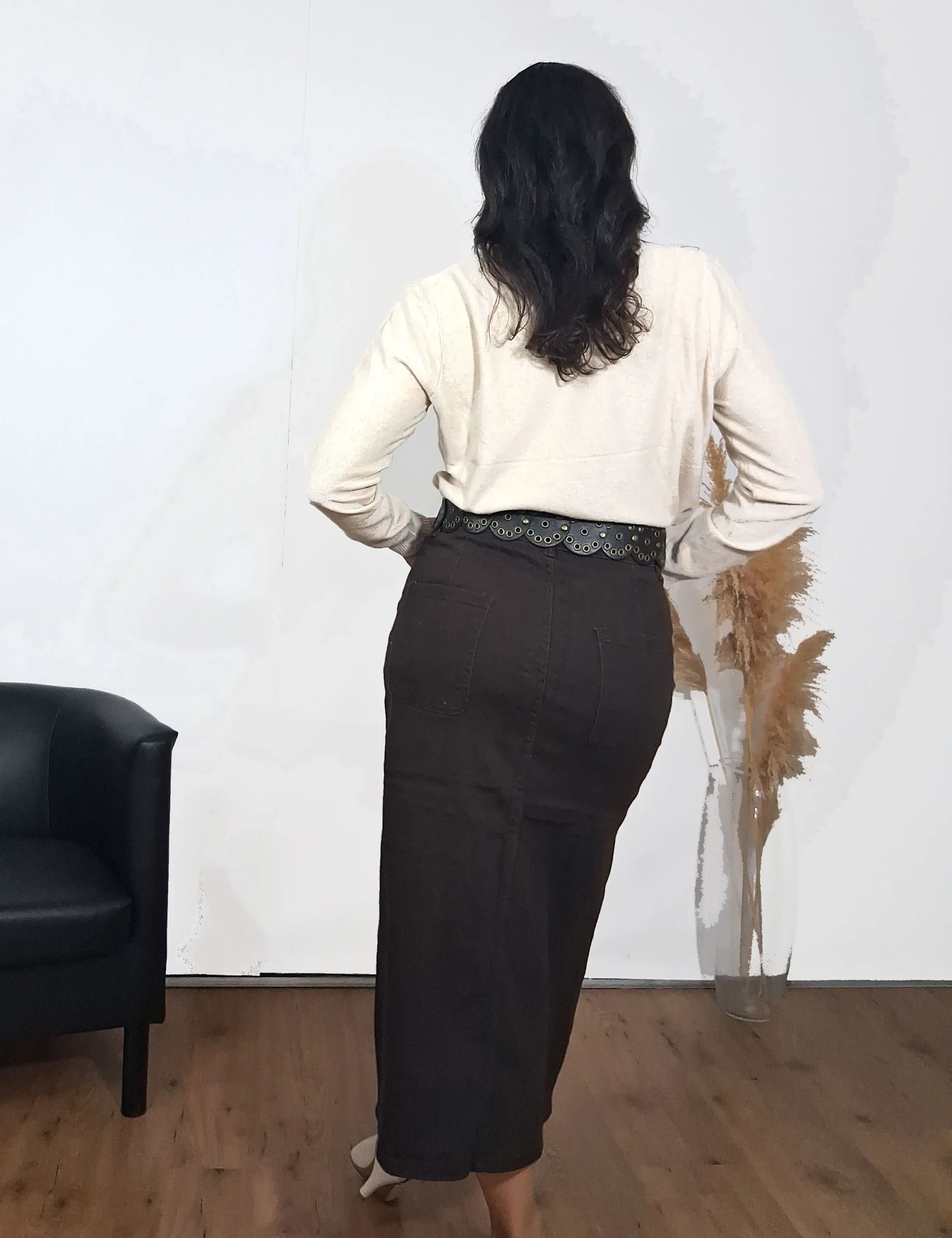Falda midi vaquera en color marrón chocolate con raja frontal y bolsillos delanteros.