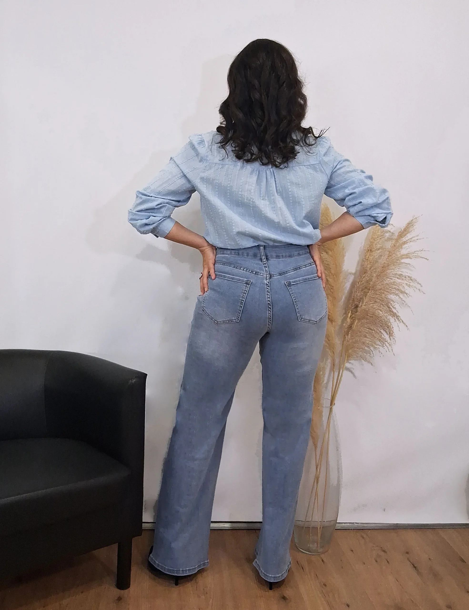 Jeans straight con detalle de tachuelas decorando la parte frontal del pantalón.