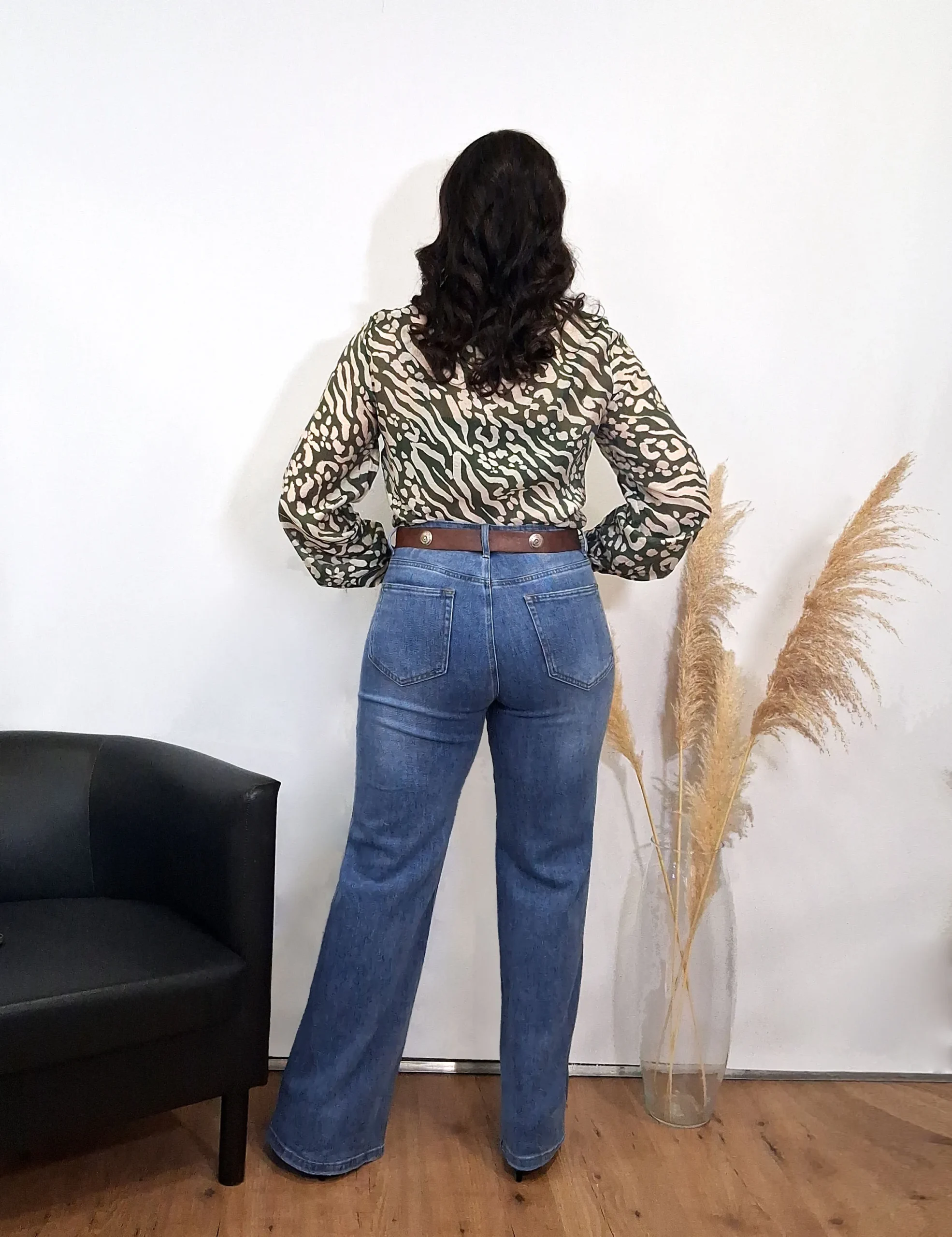 Jeans de corte wide-leg en color vaquero claro. Incluye cinturón en color camel.