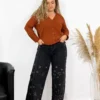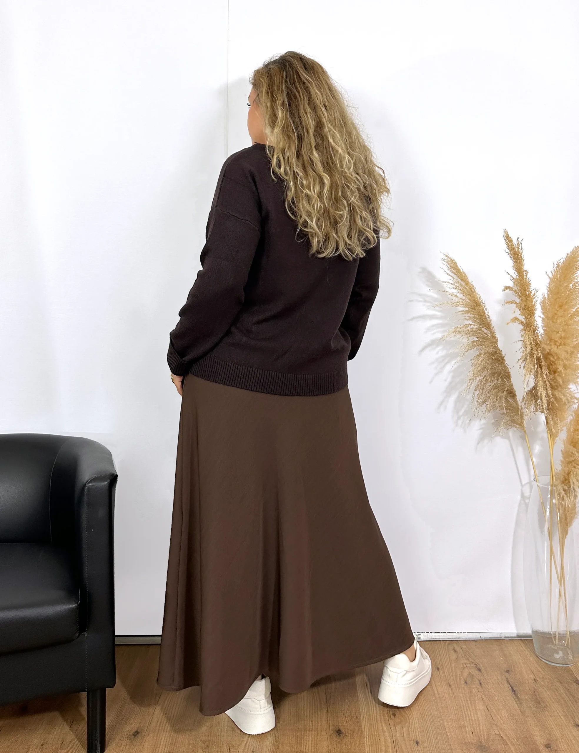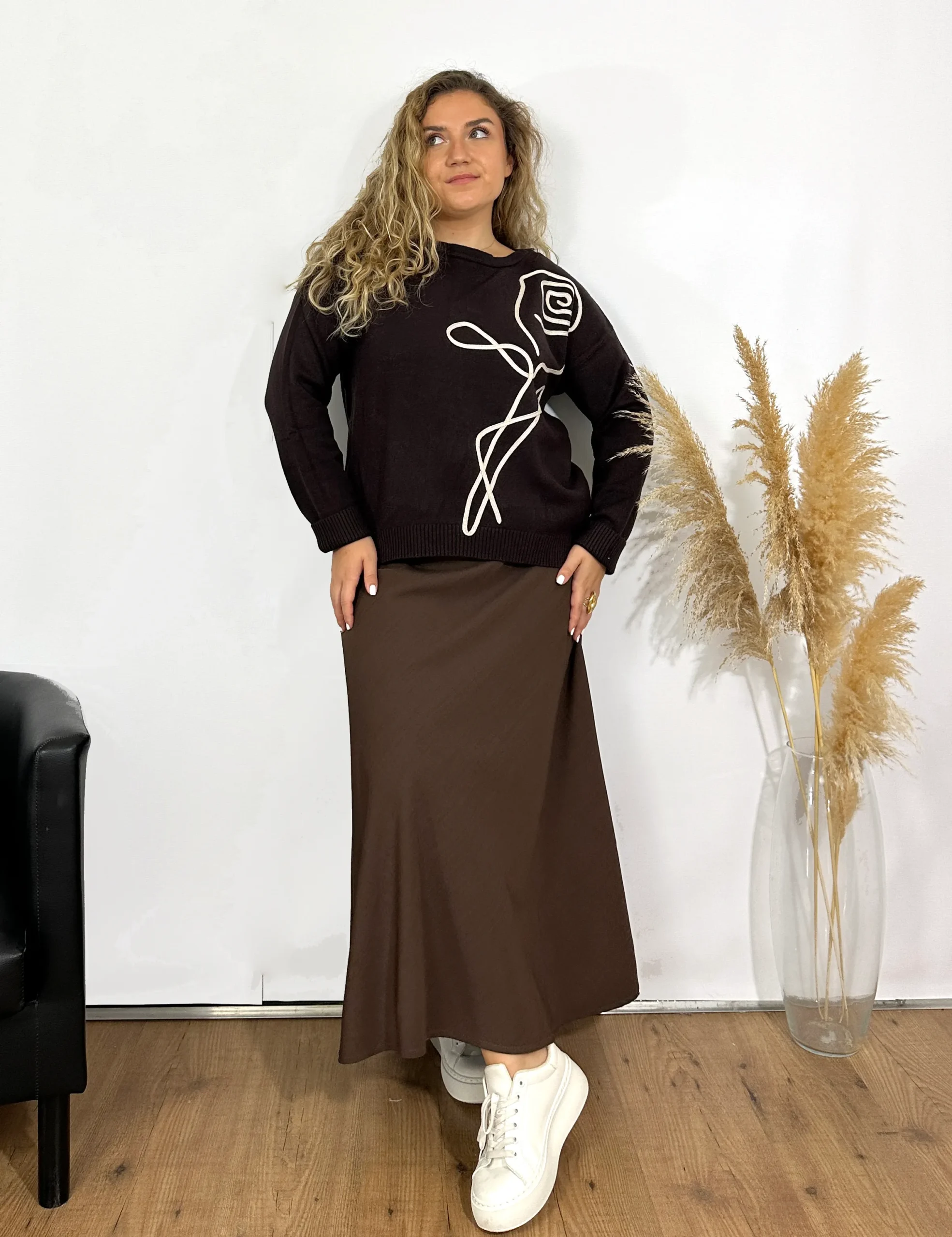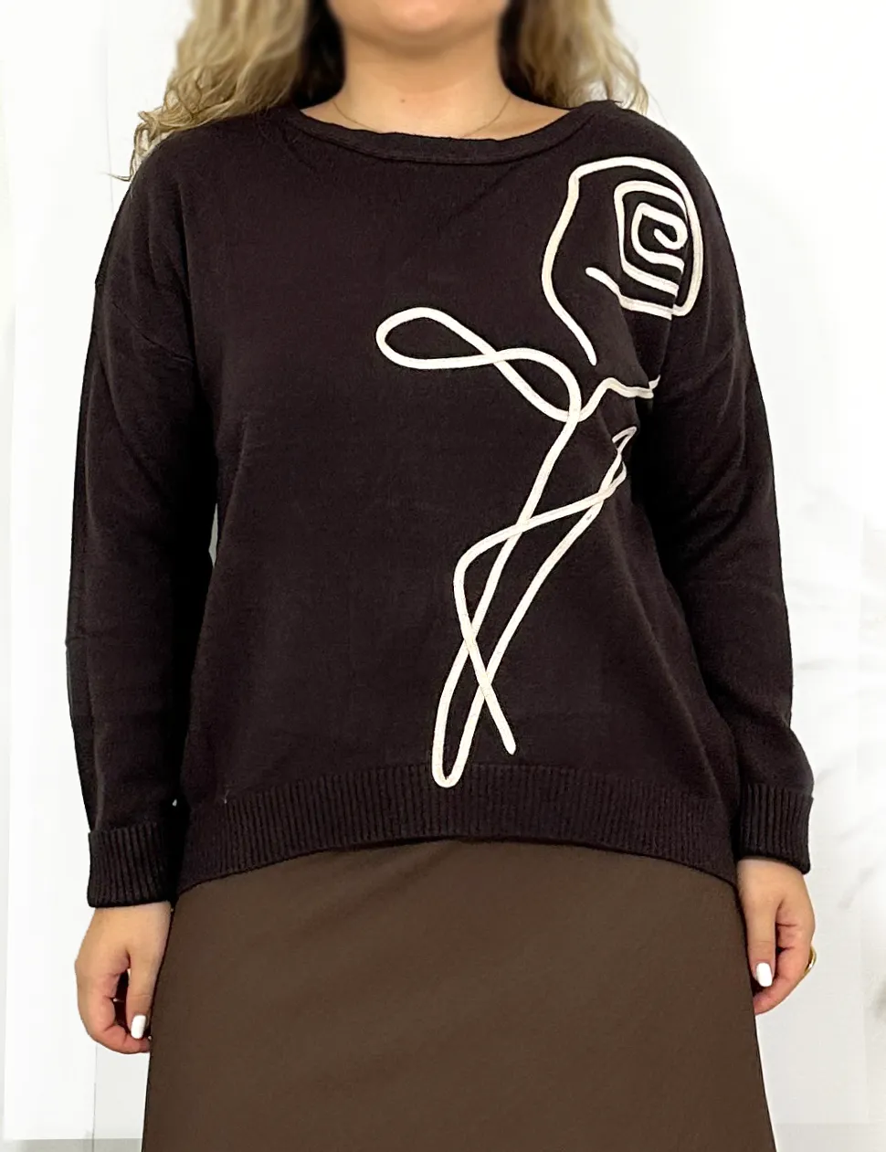 Jersey marrón chocolate con bordado de flor en color blanco. Con cuello redondo y manga larga.