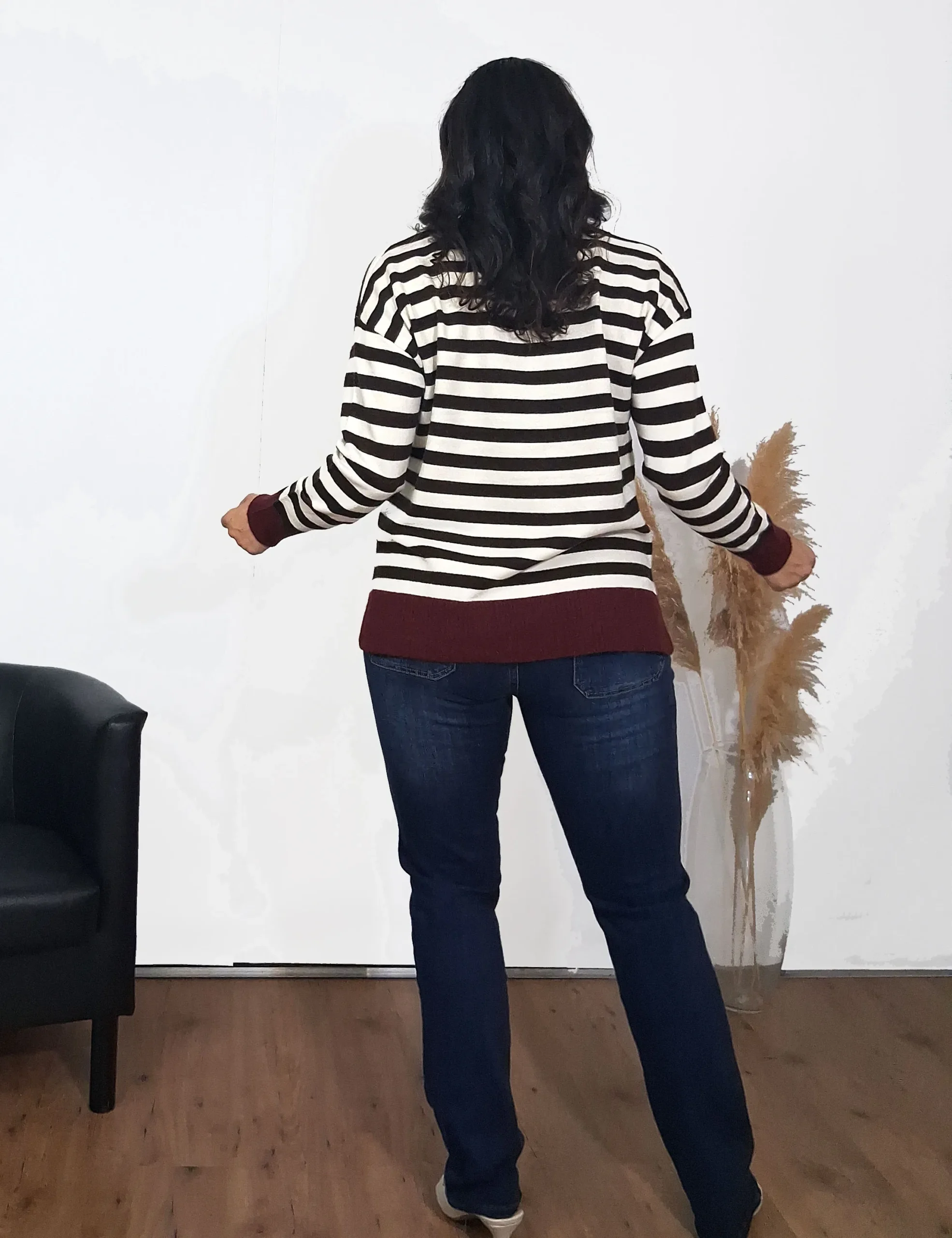 Jersey con cuello de pico diseño de rayas en tono crema y chocolate con puños y bajo en color burdeos.