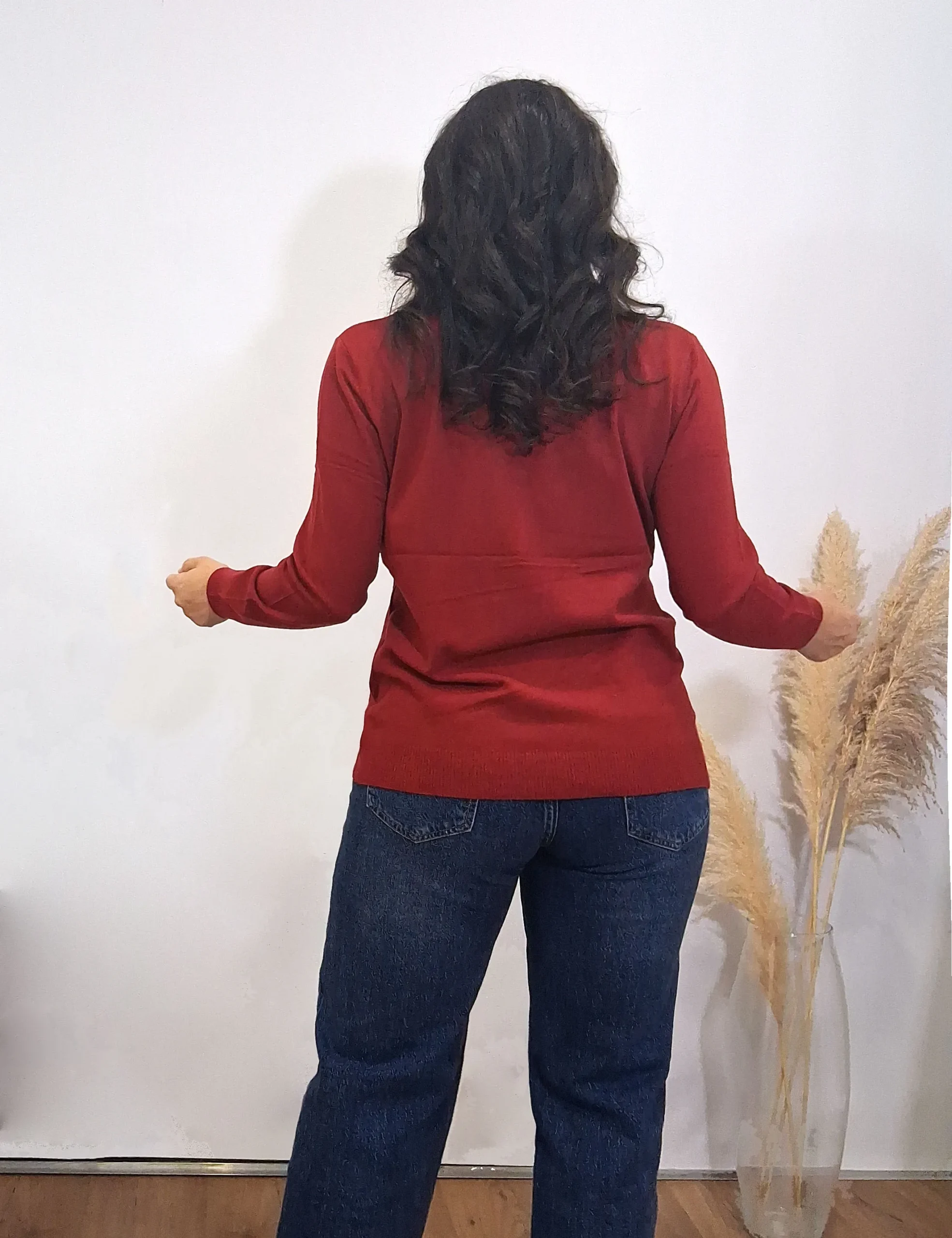 Jersey de punto con cuello vuelto de manga larga. Color rojo caldera.