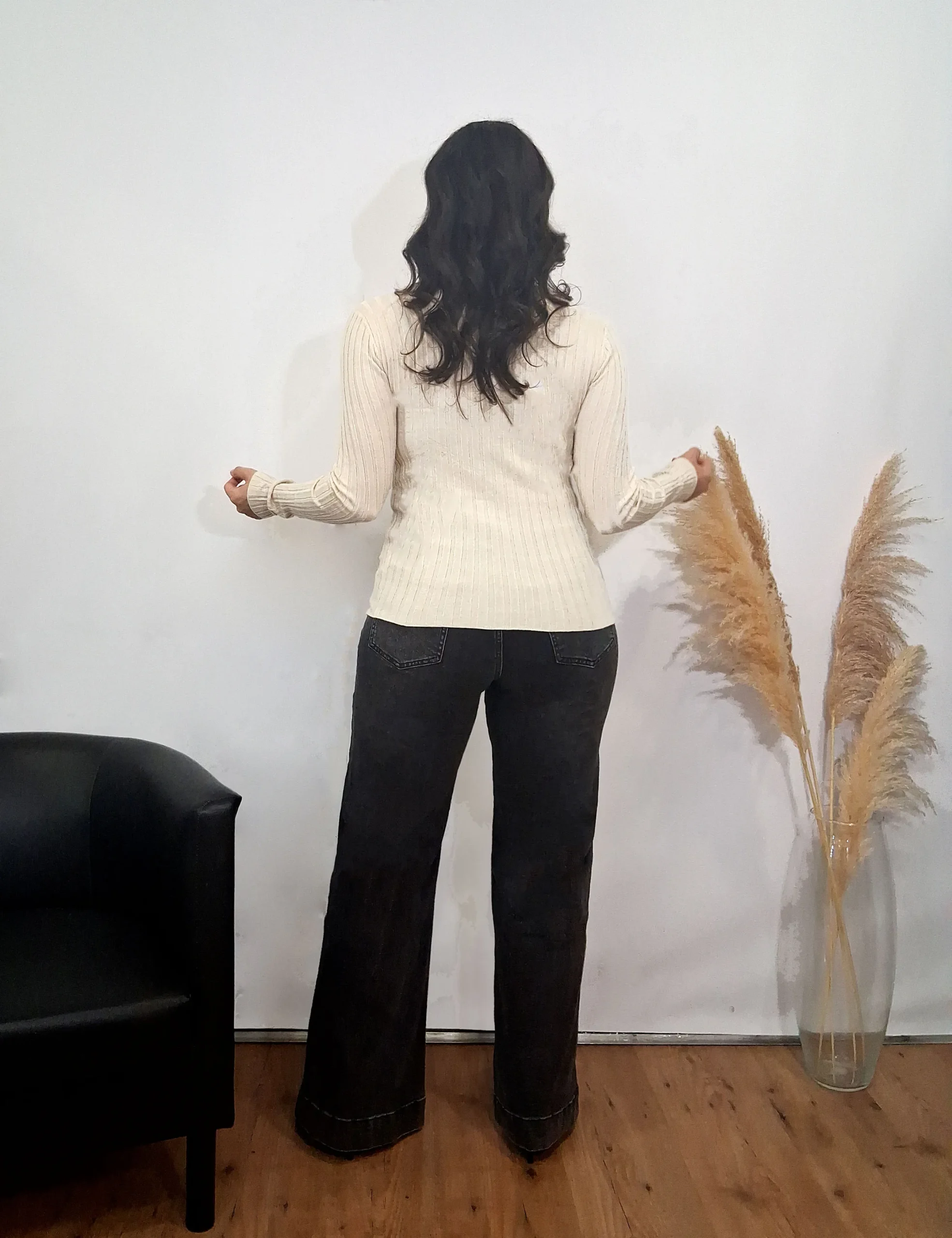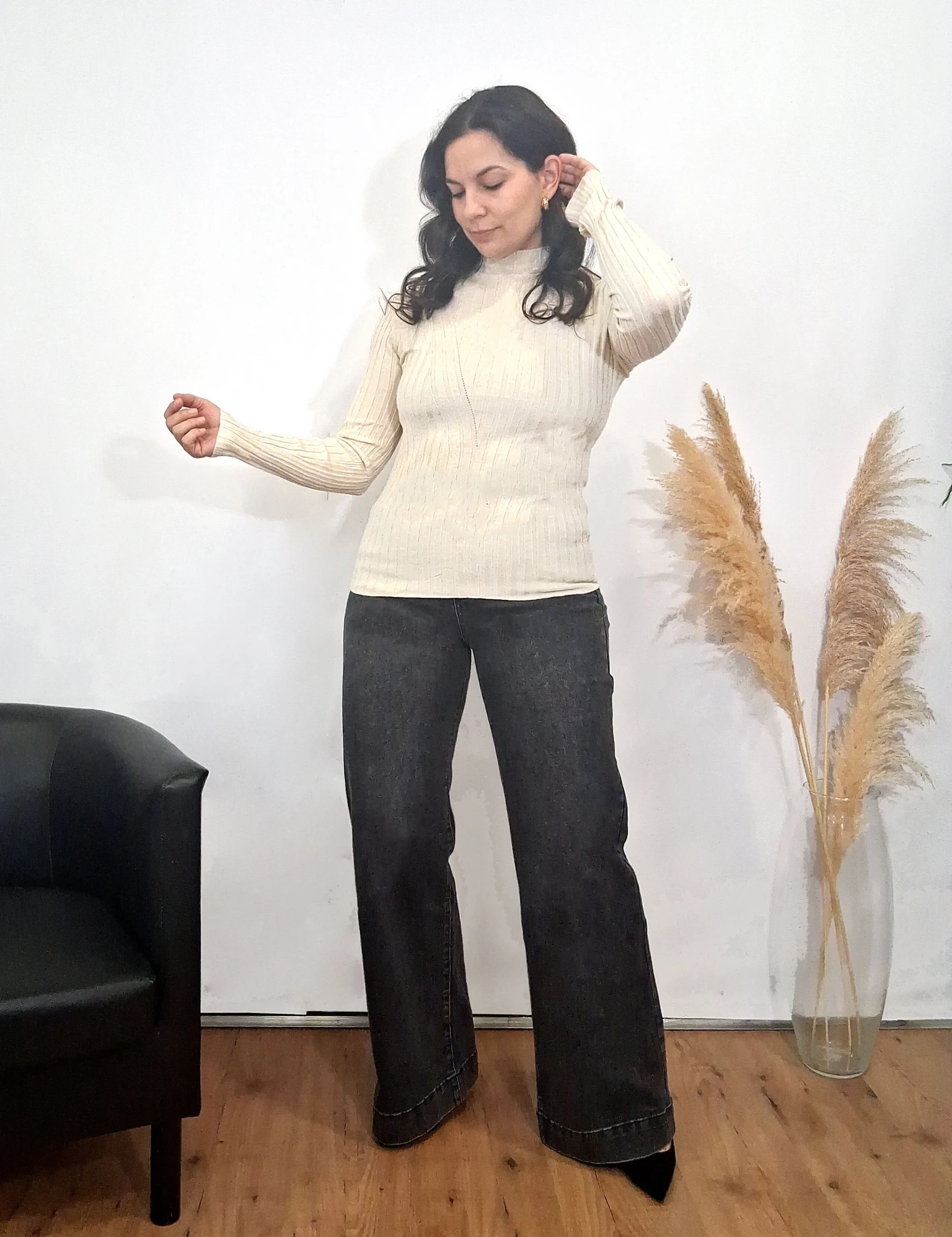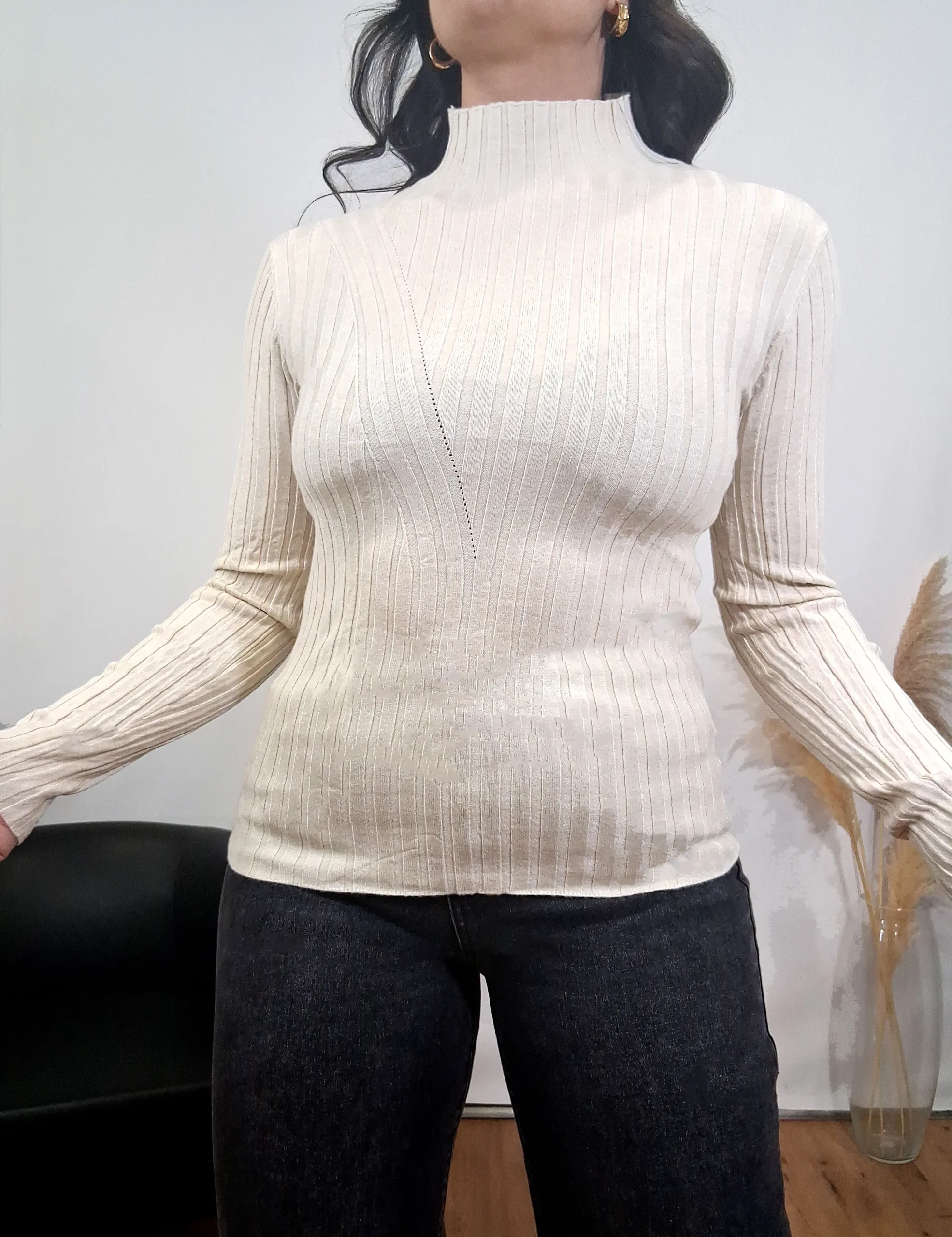 Jersey de punto trenzado de cuello alto en color crema.