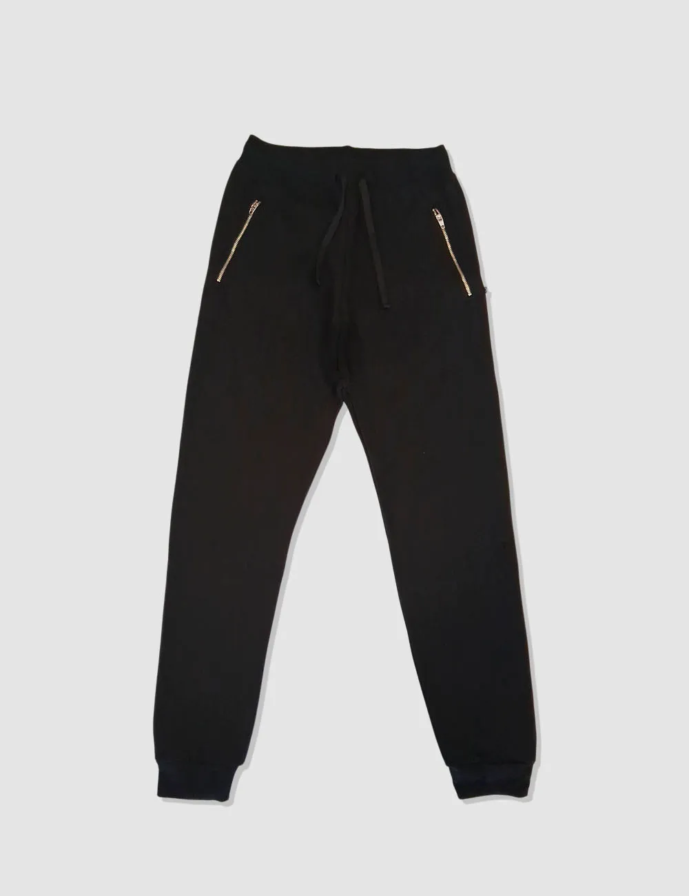 Pantalón de chandal con pelo por dentro y cremalleras en la parte delantera. Color negro.