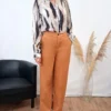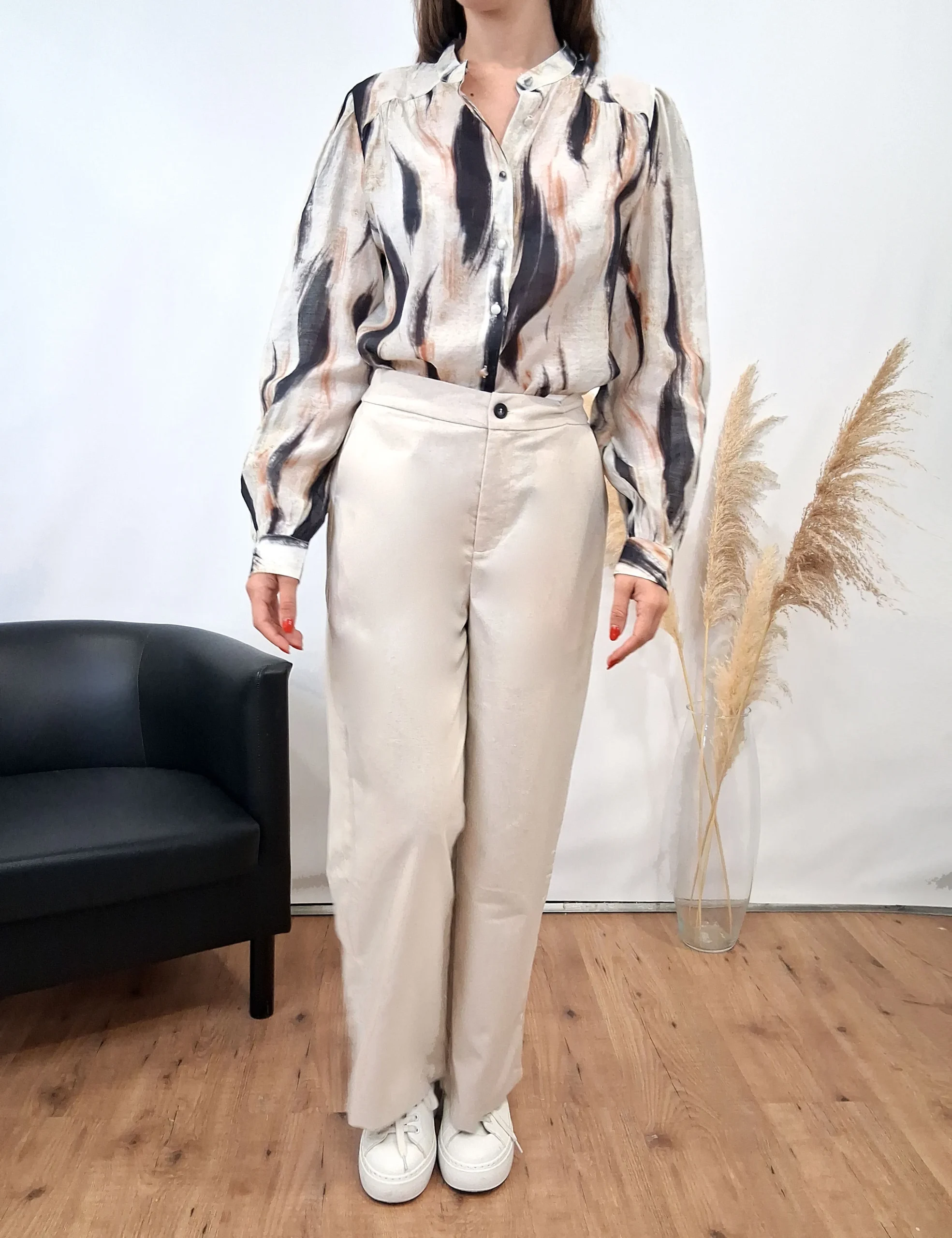 Pantalón en tejido estilo lino con elástico en la parte trasera de la cinturilla. Color crema