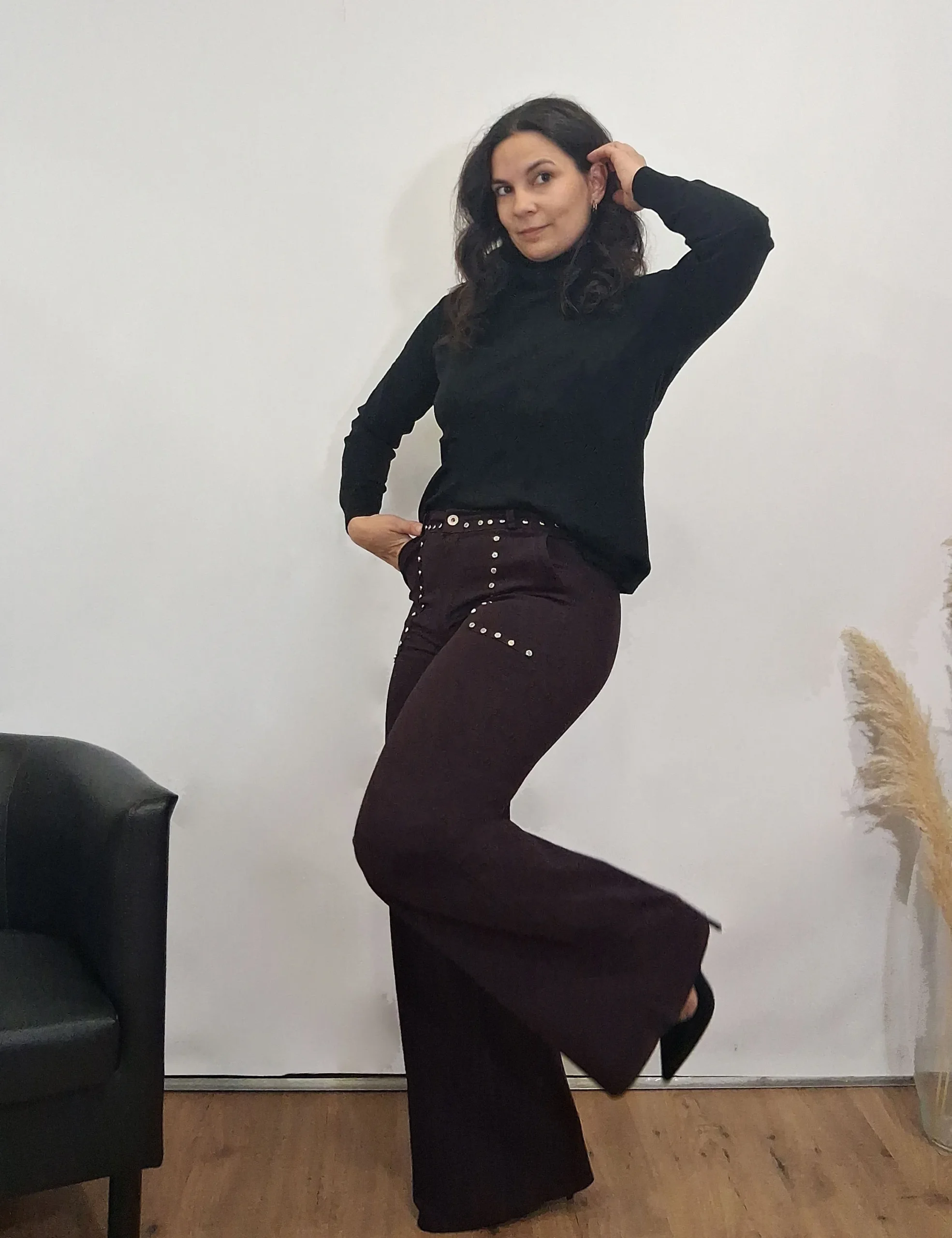 Pantalón de pata recta en color berenejena con detalle de tachuelas.