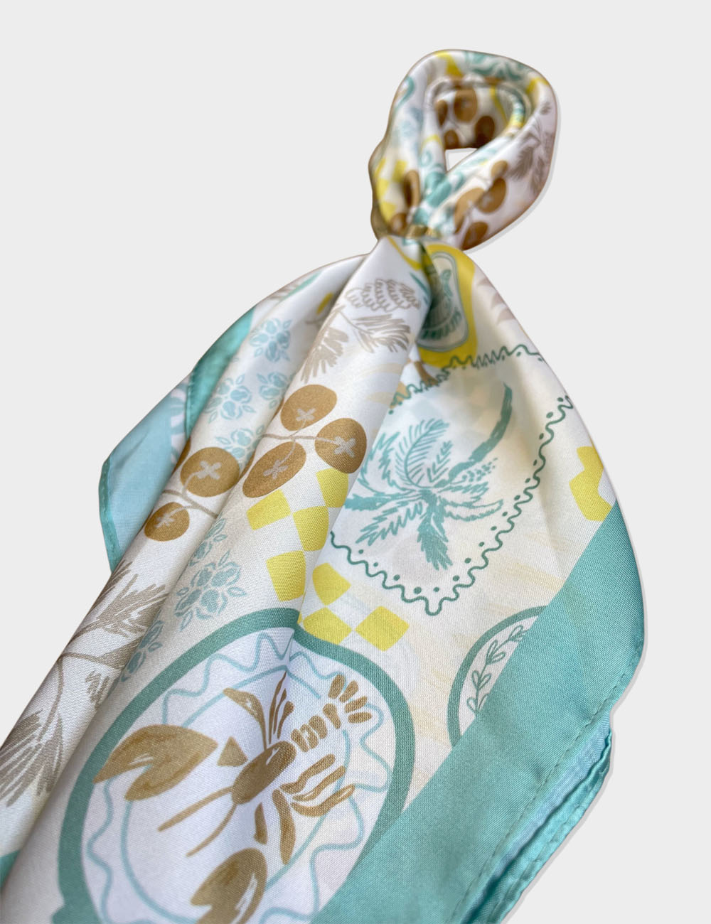 Pañuelo con estampado en tonos aguamarina, amarillo y marrón. Incluye anilla para agarre.
