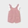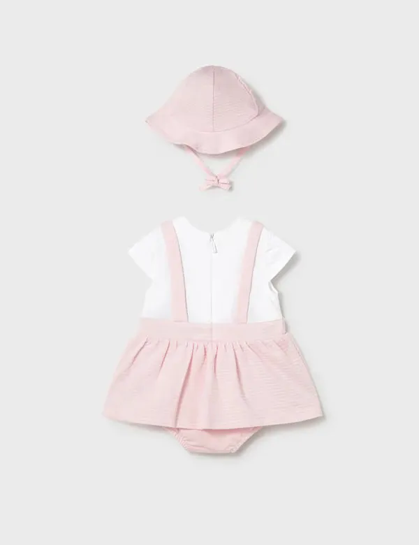 Conjunto de 3 piezas de la marca Mayoral. Incluye pelele con falda de color rosa pastel, camiseta y gorro. Detalle de perrito bordado en la parte delantera.