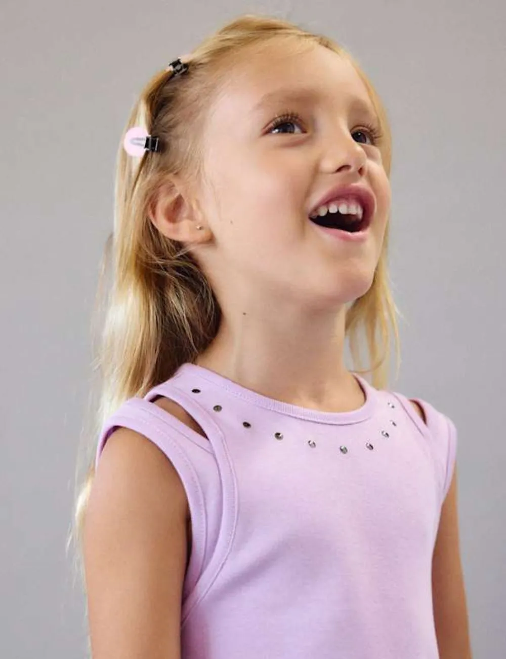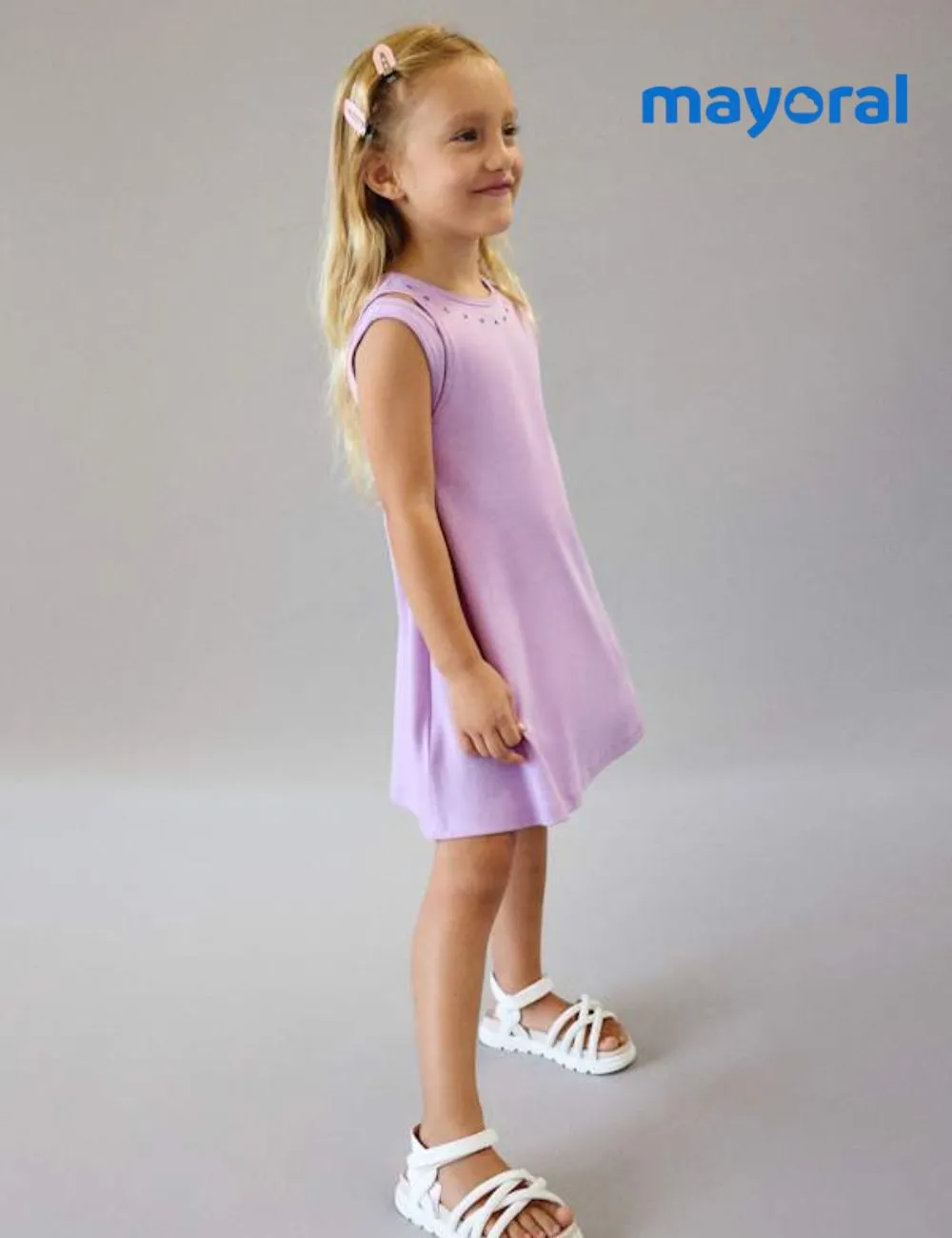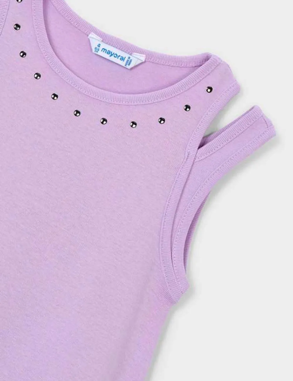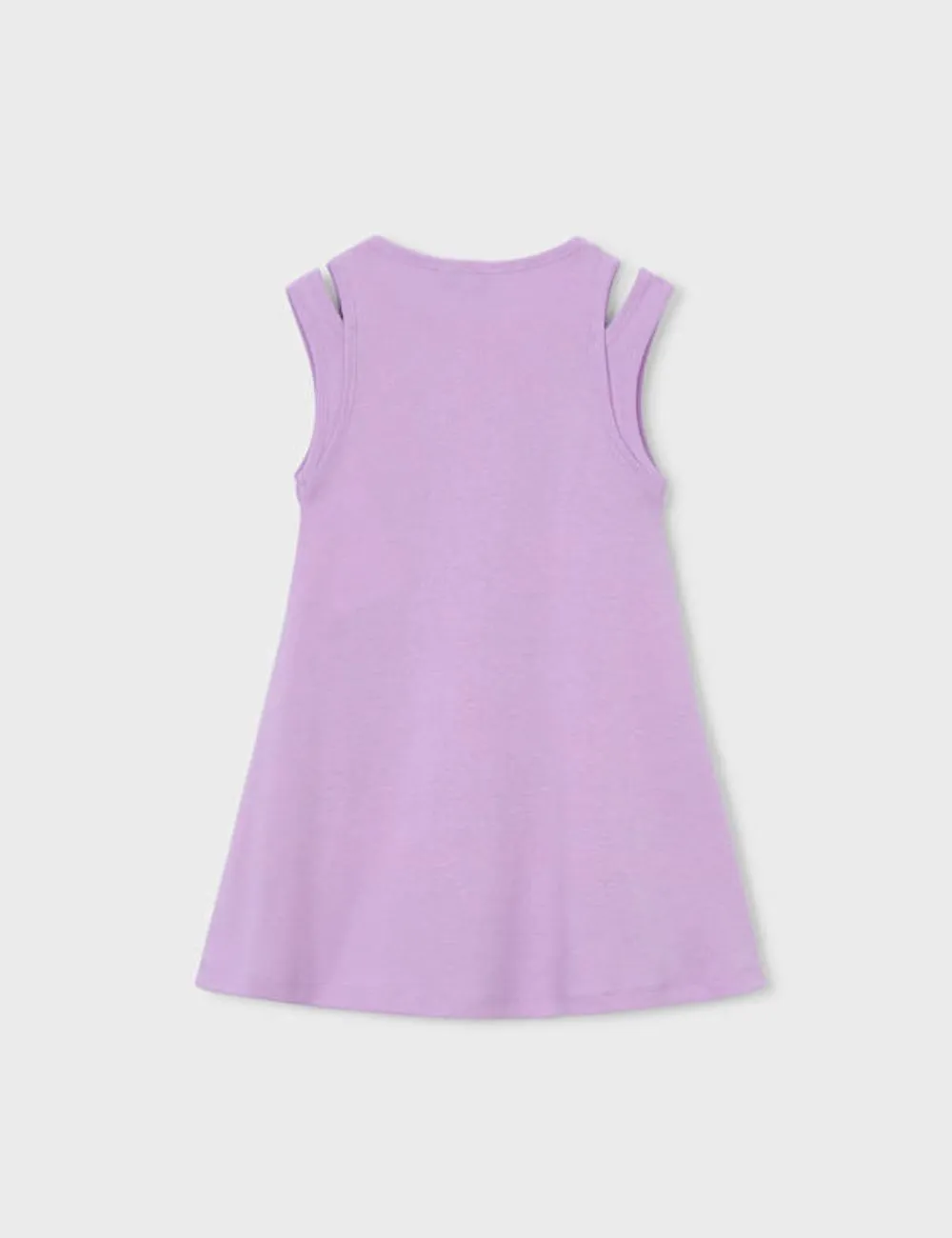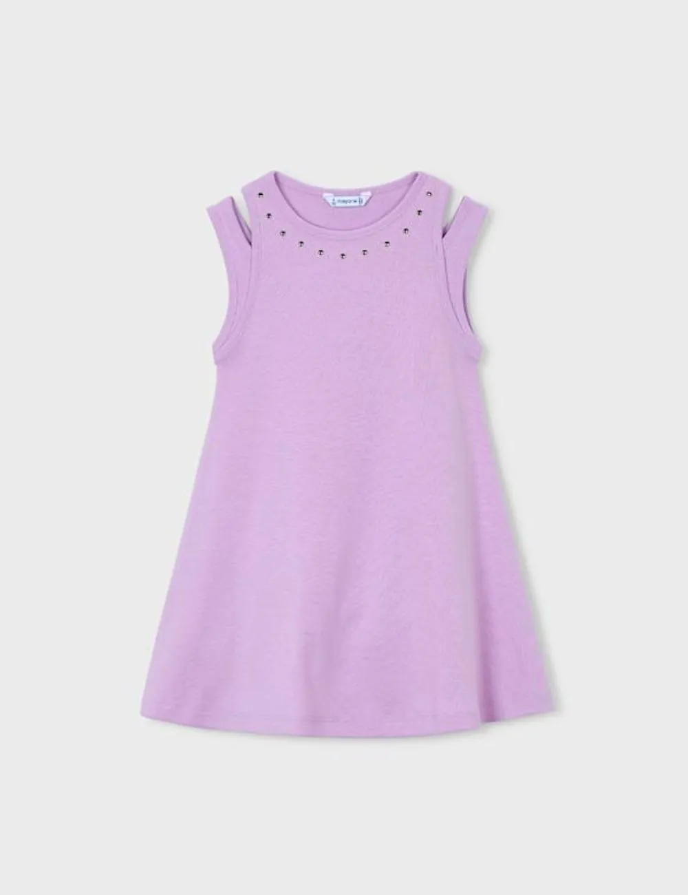 Vestido Mayoral de niña cut out con tachuelas en la parte superior . Color lila.