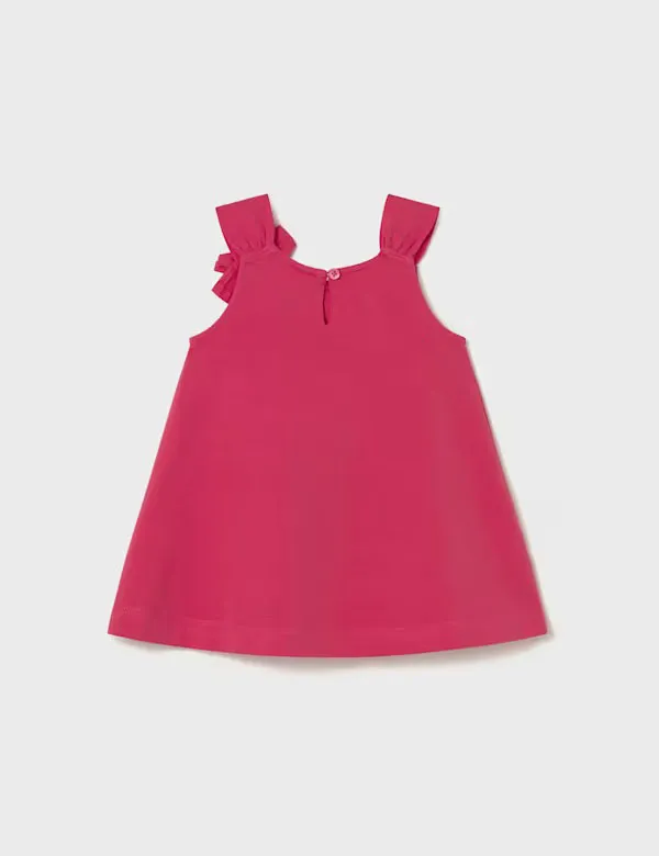 Vestido de la marca Mayoral, con detalle de lazo en tirante y diseño de dibujo en la parte delatera. Color frambuesa.