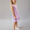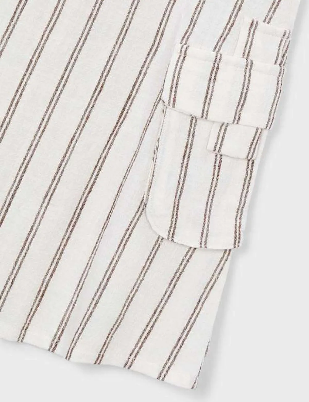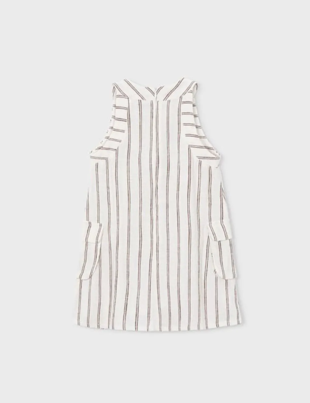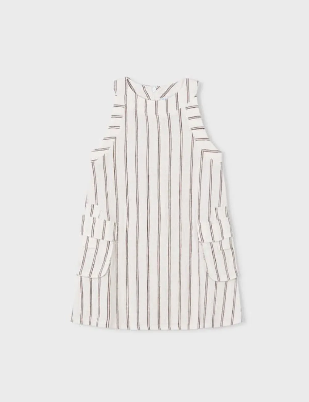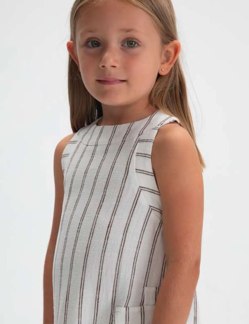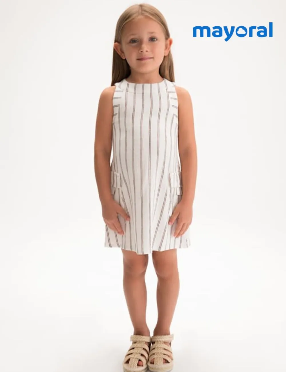 Vestido Mayoral de niña de lino corte recto con bolsillos laterales. Color hueso con rayas en color beis.